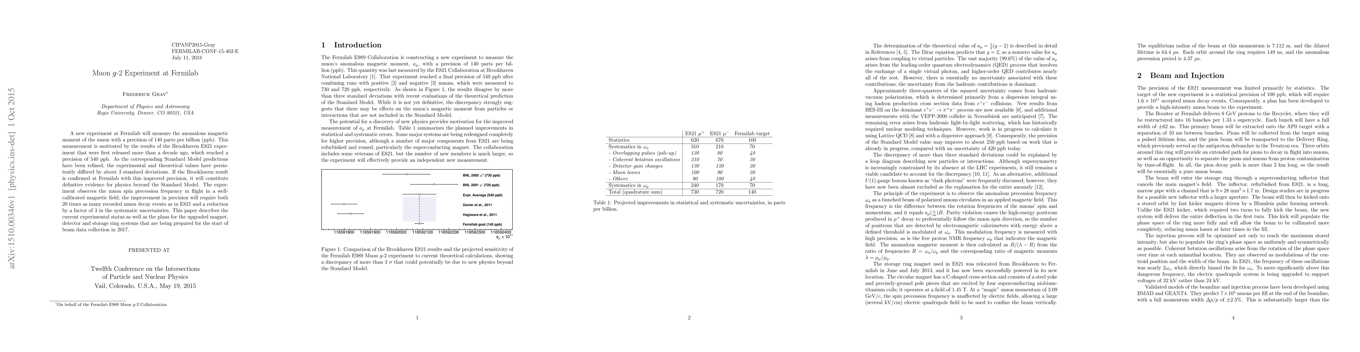The Fermilab Muon g-2 Experiment aims to measure the muon's anomalous magnetic moment with unprecedented precision, potentially confirming results from Brookhaven E821 and providing evidence for physics beyond the Standard Model. The experiment plans to achieve this by recording 20 times more muon decay events and reducing systematic uncertainties by a factor of 3.