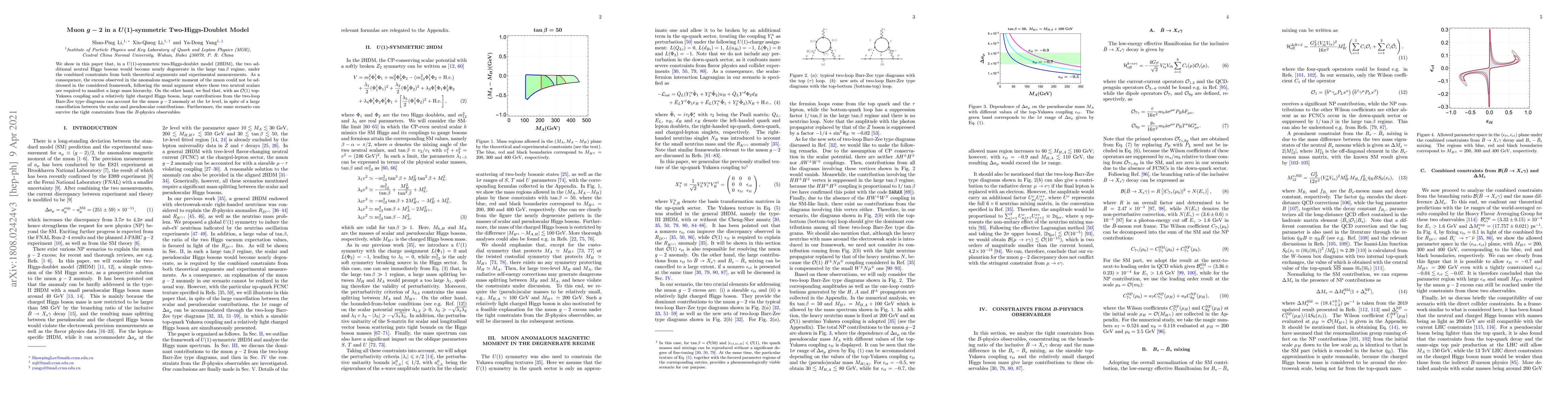 This paper explores a $U(1)$-symmetric two-Higgs-doublet model where large $\tan\beta$ causes the additional neutral Higgs bosons to become nearly degenerate, failing to resolve the muon $g-2$ anomaly. However, it finds that large contributions from two-loop Barr-Zee diagrams, with an $\mathcal{O}(1)$ top-Yukawa coupling and a light charged Higgs, can account for the anomaly while satisfying $B$-physics constraints.