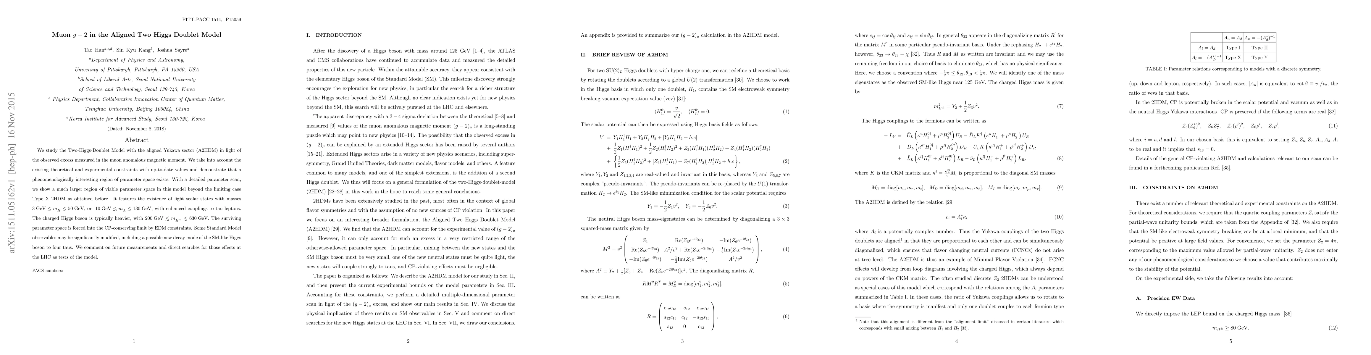 We study the Two-Higgs-Doublet Model with the aligned Yukawa sector (A2HDM) in light of the observed excess measured in the muon anomalous magnetic moment. We take into account the existing theoretical and experimental constraints with up-to-date values and demonstrate that a phenomenologically interesting region of parameter space exists. With a detailed parameter scan, we show a much larger region of viable parameter space in this model beyond the limiting case Type X 2HDM as obtained before. It features the existence of light scalar states with masses $3$ GeV $\lesssim m_H^{} \lesssim 50$ GeV, or $\ 10$ GeV $\lesssim m_A^{} \lesssim 130$ GeV, with enhanced couplings to tau leptons. The charged Higgs boson is typically heavier, with $200$ GeV $ \lesssim m^{}_{H^+} \lesssim 630$ GeV. The surviving parameter space is forced into the CP-conserving limit by EDM constraints. Some Standard Model observables may be significantly modified, including a possible new decay mode of the SM-like Higgs boson to four taus. We comment on future measurements and direct searches for those effects at the LHC as tests of the model.