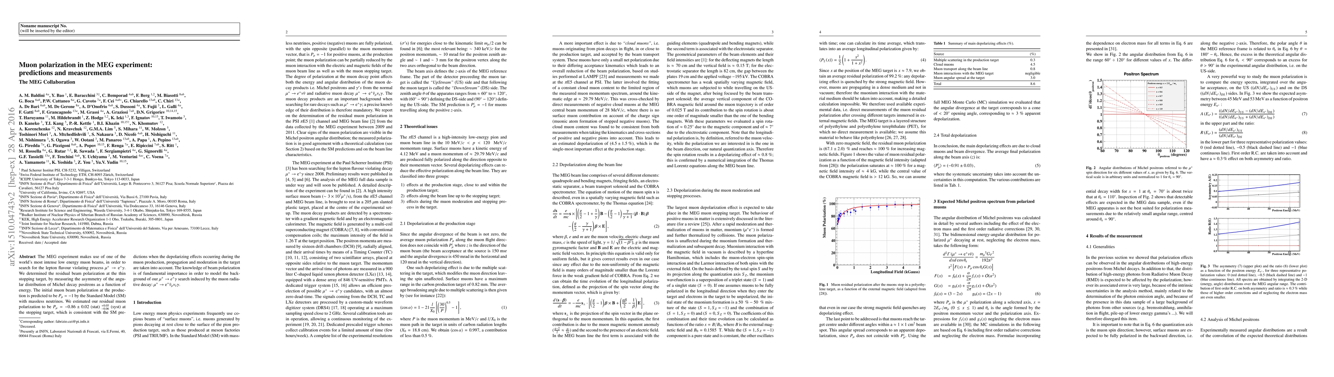 The MEG experiment makes use of one of the world's most intense low energy muon beams, in order to search for the lepton flavour violating process $\mu^{+} \rightarrow {\rm e}^{+} \gamma$. We determined the residual beam polarization at the thin stopping target, by measuring the asymmetry of the angular distribution of Michel decay positrons as a function of energy. The initial muon beam polarization at the production is predicted to be $P_{\mu} = -1$ by the Standard Model (SM) with massless neutrinos. We estimated our residual muon polarization to be $P_{\mu} = -0.85 \pm 0.03 ~ {\rm (stat)} ~ { }^{+ 0.04}_{-0.05} ~ {\rm (syst)}$ at the stopping target, which is consistent with the SM predictions when the depolarizing effects occurring during the muon production, propagation and moderation in the target are taken into account. The knowledge of beam polarization is of fundamental importance in order to model the background of our ${\megsign}$ search induced by the muon radiative decay: $\mu^{+} \rightarrow {\rm e}^{+} \bar{\nu}_{\mu} \nu_{\rm e} \gamma$.
