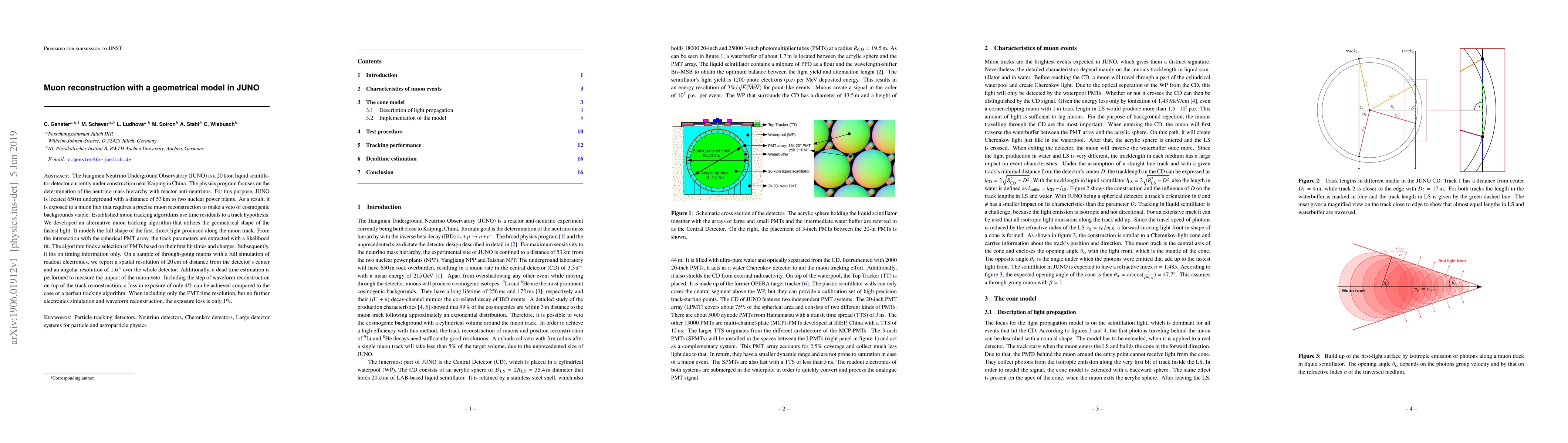 The Jiangmen Neutrino Underground Observatory (JUNO) has developed a new muon tracking algorithm using the geometrical shape of the first light produced along muon tracks, achieving a spatial resolution of 20 cm and an angular resolution of 1.6°, with minimal exposure loss of 4% when including waveform reconstruction.