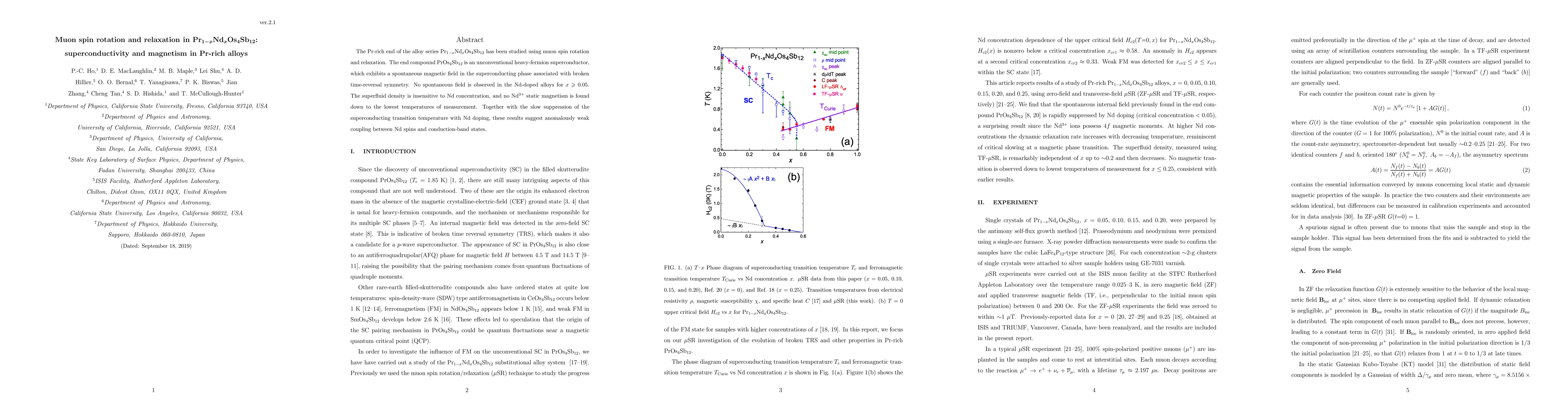 This study investigates the Pr-rich alloy Pr$_{1-x}$Nd$_x$Os$_4$Sb$_{12}$ using muon spin rotation and relaxation, revealing that PrOs$_4$Sb$_{12}$ is an unconventional superconductor with a spontaneous magnetic field. Nd doping for x $>$ 0.05 eliminates spontaneous magnetic fields and shows weak coupling between Nd spins and conduction states, indicating minimal Nd$^{3+}$ static magnetism.