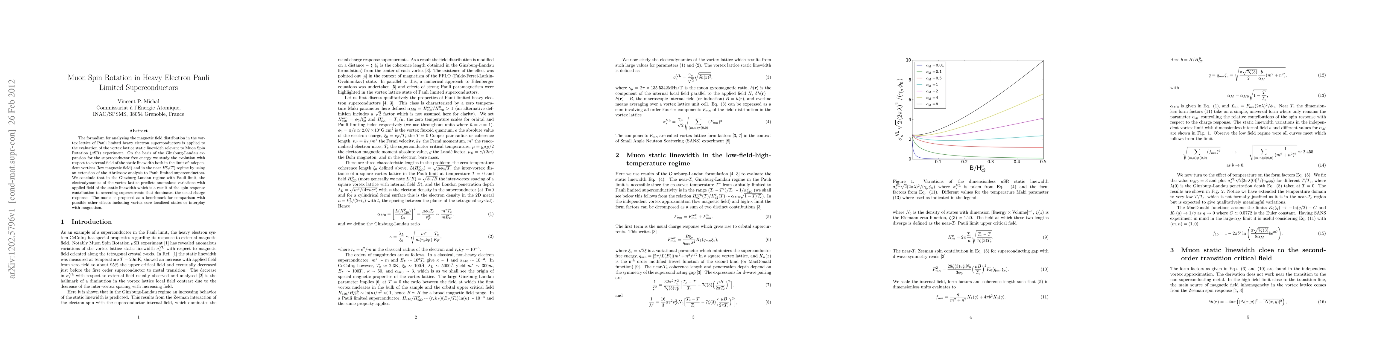 The formalism for analyzing the magnetic field distribution in the vortex lattice of Pauli limited heavy electron superconductors is applied to the evaluation of the vortex lattice static linewidth relevant to Muon Spin Rotation ($\mu$SR) experiment. On the basis of the Ginzburg-Landau expansion for the superconductor free energy we study the evolution with respect to external field of the static linewidth both in the limit of independent vortices (low magnetic field) and in the near $H_\mathrm{c2}^\mathrm{p}(T)$ regime by using an extension of the Abrikosov analysis to Pauli limited superconductors. We conclude that in the Ginzburg-Landau regime with Pauli limit, the electrodynamics of the vortex lattice predicts anomalous variations with applied field of the static linewidth which is a result of the spin response contribution to screening supercurrents that dominates the usual charge response. The model is proposed as a benchmark for comparison with possible other effects including vortex core localized states or interplay with magnetism.