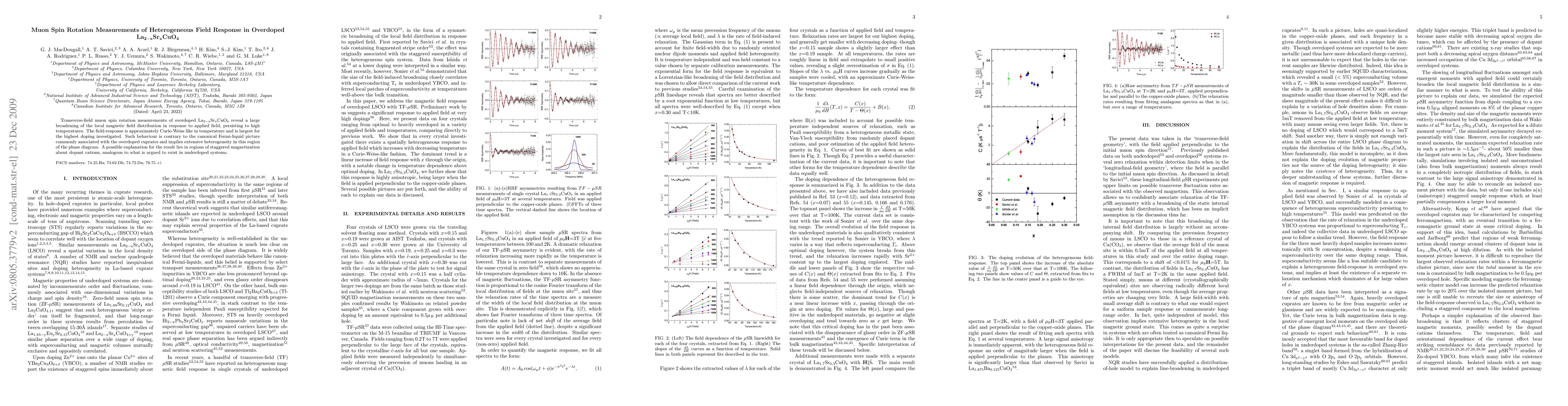 This paper reports on transverse-field muon spin rotation measurements in overdoped La2-xSrxCuO4, revealing a large and temperature-dependent broadening of the local magnetic field distribution. This behavior suggests extensive heterogeneity and challenges the canonical Fermi-liquid model, hinting at staggered magnetization regions around dopant cations.