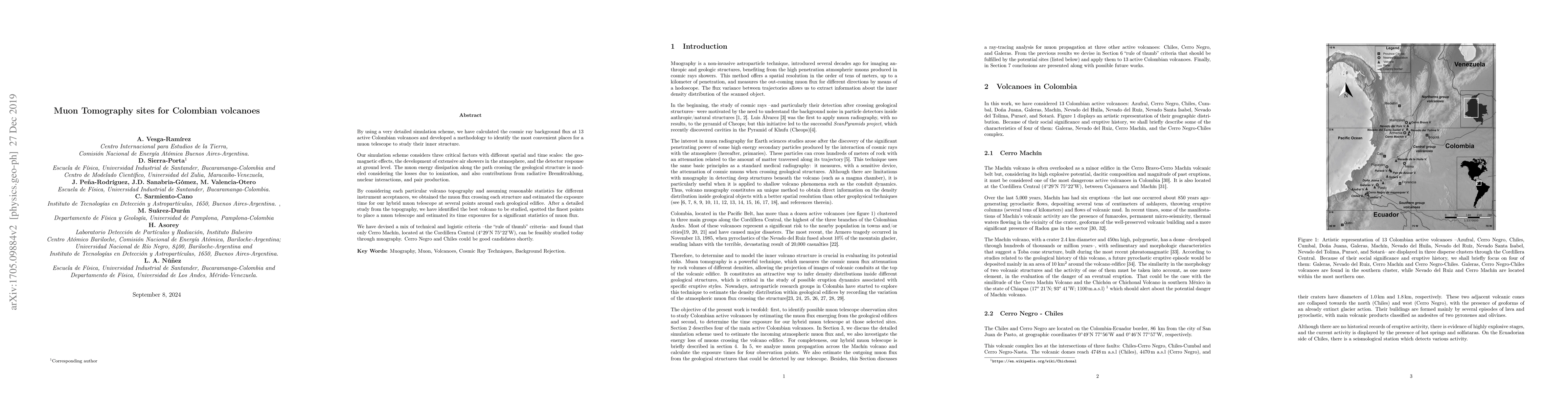 By using a very detailed simulation scheme, we have calculated the cosmic ray background flux at 13 active Colombian volcanoes and developed a methodology to identify the most convenient places for a muon telescope to study their inner structure. Our simulation scheme considers three critical factors with different spatial and time scales: the geomagnetic effects, the development of extensive air showers in the atmosphere, and the detector response at ground level. The muon energy dissipation along the path crossing the geological structure is modeled considering the losses due to ionization, and also contributions from radiative Bremstrahlung, nuclear interactions, and pair production. By considering each particular volcano topography and assuming reasonable statistics for different instrument acceptances, we obtained the muon flux crossing each structure and estimated the exposure time for our hybrid muon telescope at several points around each geological edifice. After a detailed study from the topography, we have identified the best volcano to be studied, spotted the finest points to place a muon telescope and estimated its time exposures for a significant statistics of muon flux. We have devised a mix of technical and logistic criteria --the ``rule of thumb'' criteria-- and found that only Cerro Machin, located at the Cordillera Central (4$^{\circ}$29'N 75$^{\circ}$22'W), can be feasibly studied today through muography. Cerro Negro and Chiles could be good candidates shortly