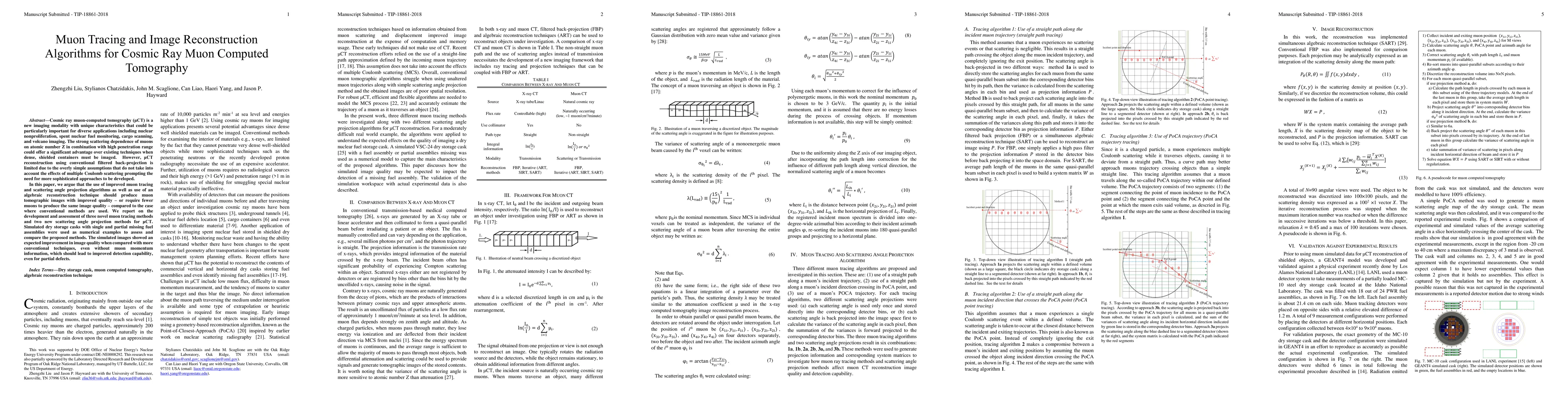 Cosmic ray muon computed tomography ({\mu}CT) is a new imaging modality with unique characteristics that could be particularly important for diverse applications including nuclear nonproliferation, spent nuclear fuel monitoring, cargo scanning, and volcano imaging. The strong scattering dependence of muons on atomic number Z in combination with high penetration range could offer a significant advantage over existing techniques when dense, shielded containers must be imaged. However, {\mu}CT reconstruction using conventional filtered back-projection is limited due to the overly simple assumptions that do not take into account the effects of multiple Coulomb scattering prompting the need for more sophisticated approaches to be developed. In this paper, we argue that the use of improved muon tracing and scattering angle projection algorithms as well as use of an algebraic reconstruction technique should produce muon tomographic images with improved quality or require fewer muons to produce the same image quality compared to the case where conventional methods are used. We report on the development and assessment of three novel muon tracing methods and two new scattering angle projection methods for {\mu}CT. Simulated dry storage casks with single and partial missing fuel assemblies were used as numerical examples to assess and compare the proposed methods. The simulated images showed an expected improvement in image quality when compared with more conventional techniques, even without muon momentum information, which should lead to improved detection capability, even for partial defects.