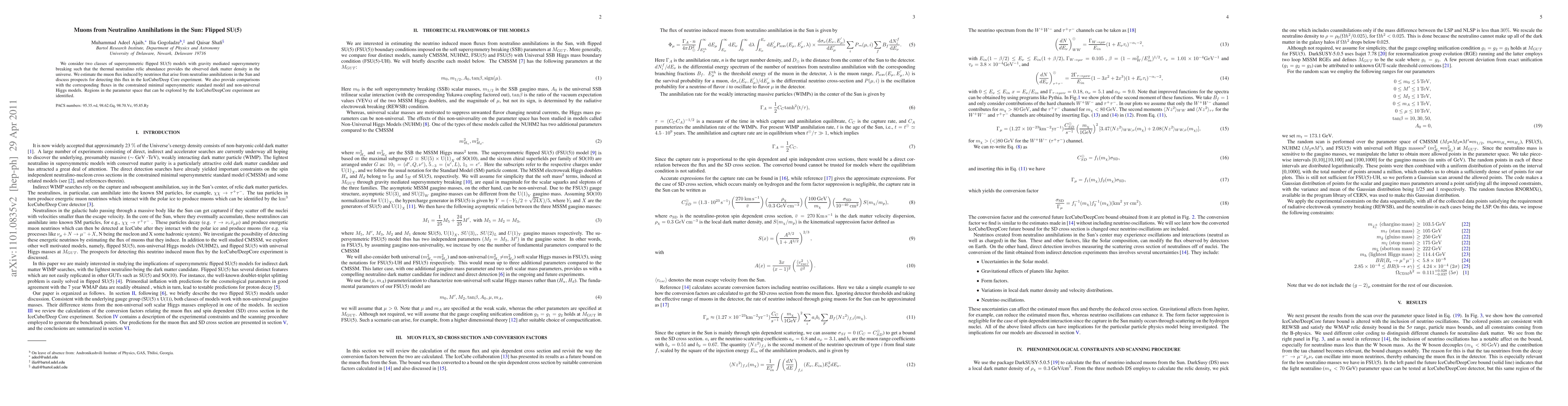 We consider two classes of supersymmetric flipped SU(5) models with gravity mediated supersymmetry breaking such that the thermal neutralino relic abundance provides the observed dark matter density in the universe. We estimate the muon flux induced by neutrinos that arise from neutralino annihilations in the Sun and discuss prospects for detecting this flux in the IceCube/Deep Core experiment. We also provide comparisons with the corresponding fluxes in the constrained minimal supersymmetric standard model and non-universal Higgs models. Regions in the parameter space that can be explored by the IceCube/DeepCore experiment are identified.