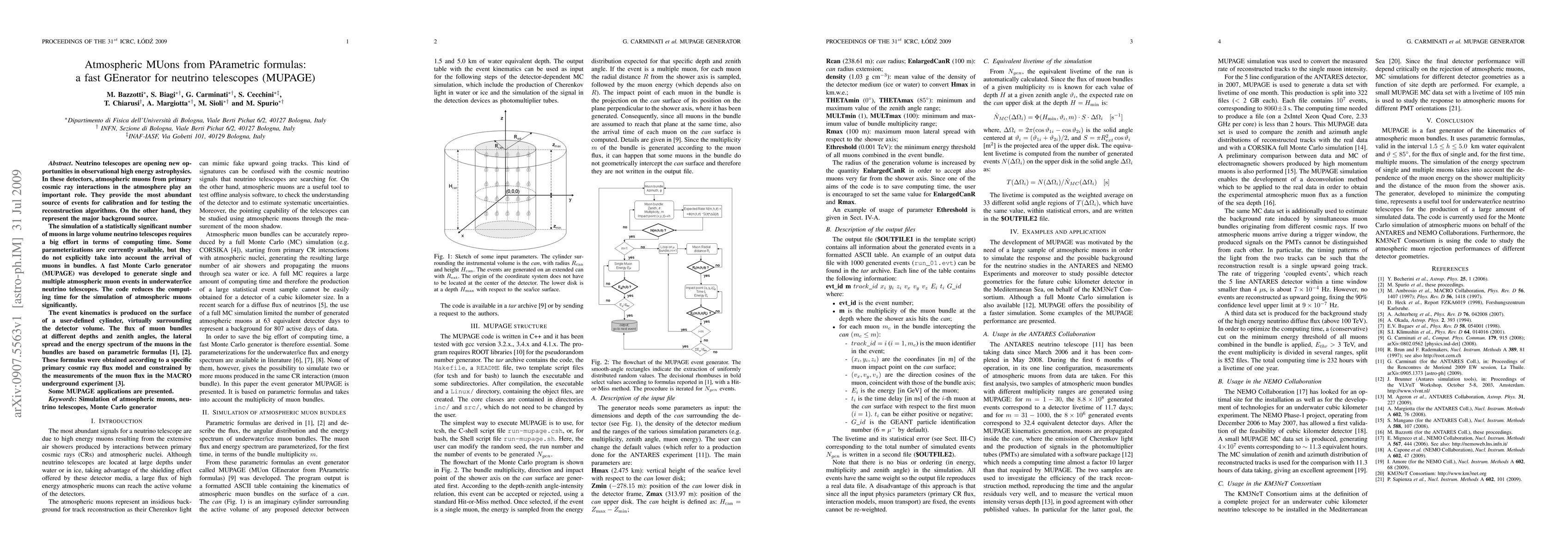 Neutrino telescopes are opening new opportunities in observational high energy astrophysics. In these detectors, atmospheric muons from primary cosmic ray interactions in the atmosphere play an important role. They provide the most abundant source of events for calibration and for testing the reconstruction algorithms. On the other hand, they represent the major background source. The simulation of a statistically significant number of muons in large volume neutrino telescopes requires a big effort in terms of computing time. Some parameterizations are currently available, but they do not explicitly take into account the arrival of muons in bundles. A fast Monte Carlo generator (MUPAGE) was developed to generate single and multiple atmospheric muon events in underwater/ice neutrino telescopes. The code reduces the computing time for the simulation of atmospheric muons significantly. The event kinematics is produced on the surface of a user-defined cylinder, virtually surrounding the detector volume. The flux of muon bundles at different depths and zenith angles, the lateral spread and the energy spectrum of the muons in the bundles are based on parametric formulas. These formulas were obtained according to a specific primary cosmic ray flux model and constrained by the measurements of the muon flux in the MACRO underground experiment. Some MUPAGE applications are presented.