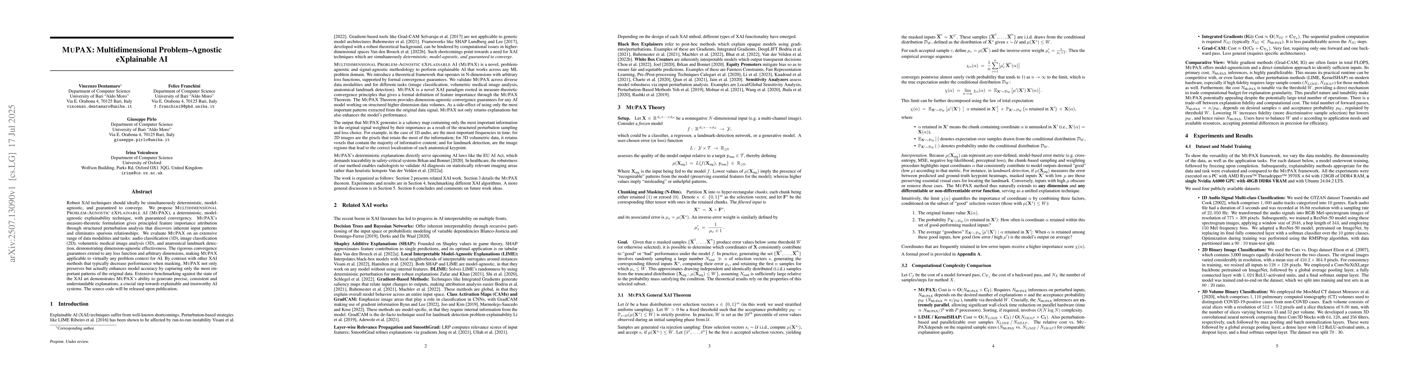 Robust XAI techniques should ideally be simultaneously deterministic, model agnostic, and guaranteed to converge. We propose MULTIDIMENSIONAL PROBLEM AGNOSTIC EXPLAINABLE AI (MUPAX), a deterministic, model agnostic explainability technique, with guaranteed convergency. MUPAX measure theoretic formulation gives principled feature importance attribution through structured perturbation analysis that discovers inherent input patterns and eliminates spurious relationships. We evaluate MUPAX on an extensive range of data modalities and tasks: audio classification (1D), image classification (2D), volumetric medical image analysis (3D), and anatomical landmark detection, demonstrating dimension agnostic effectiveness. The rigorous convergence guarantees extend to any loss function and arbitrary dimensions, making MUPAX applicable to virtually any problem context for AI. By contrast with other XAI methods that typically decrease performance when masking, MUPAX not only preserves but actually enhances model accuracy by capturing only the most important patterns of the original data. Extensive benchmarking against the state of the XAI art demonstrates MUPAX ability to generate precise, consistent and understandable explanations, a crucial step towards explainable and trustworthy AI systems. The source code will be released upon publication.