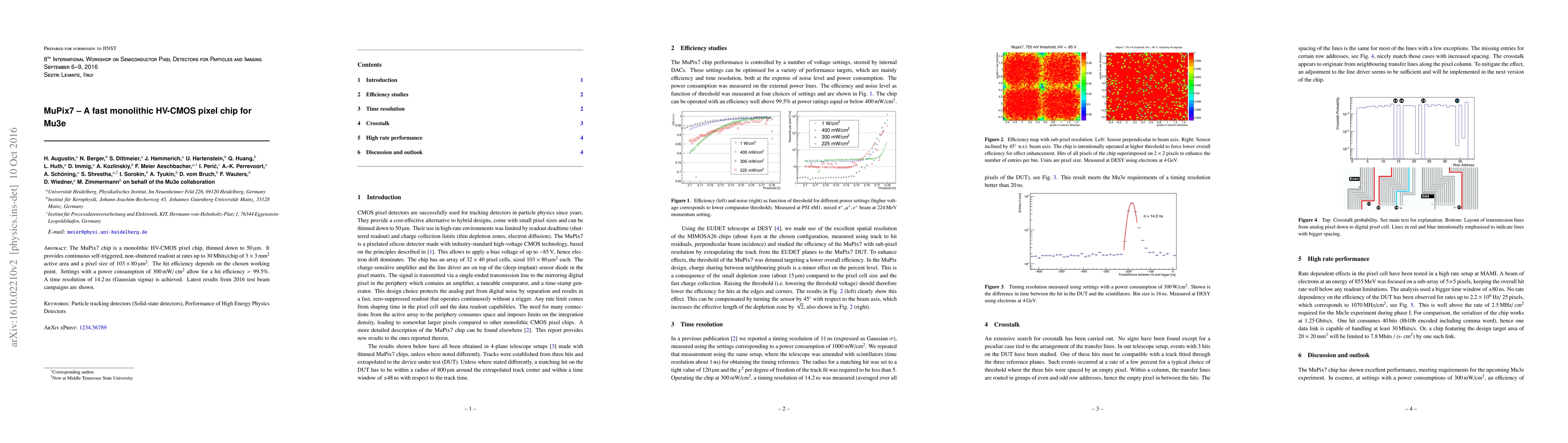 MuPix7 is a high-speed, low-power monolithic HV-CMOS pixel chip designed for the Mu3e experiment, achieving up to 30 Mhits/chip with a time resolution of 14.2 ns and a hit efficiency of over 99.5% at 300 mW/cm^2. Results from 2016 test beam campaigns demonstrate its performance.