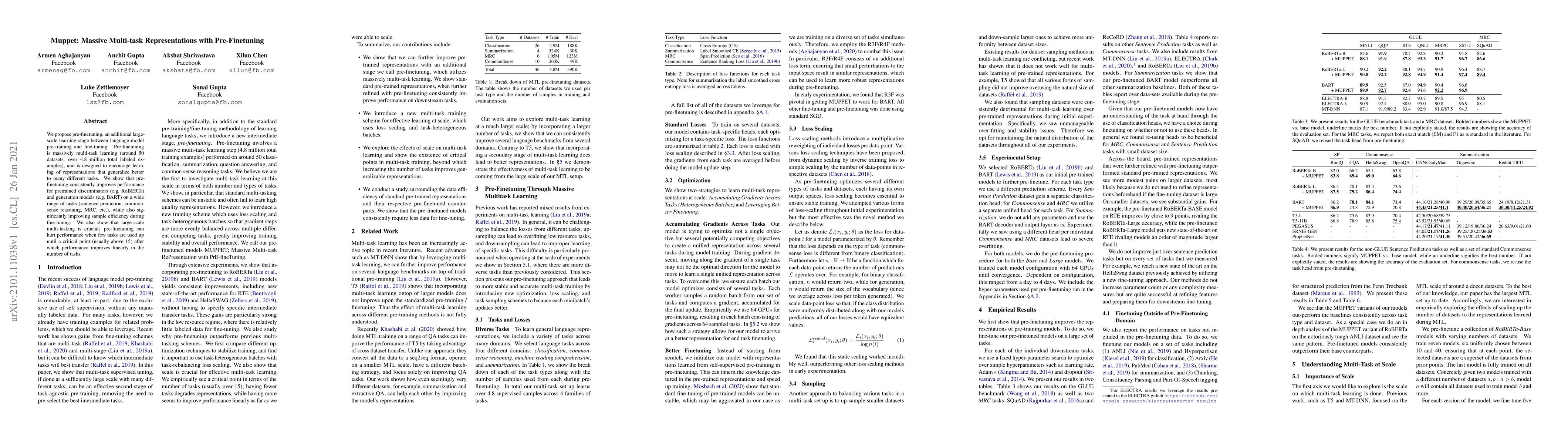 We propose pre-finetuning, an additional large-scale learning stage between language model pre-training and fine-tuning. Pre-finetuning is massively multi-task learning (around 50 datasets, over 4.8 million total labeled examples), and is designed to encourage learning of representations that generalize better to many different tasks. We show that pre-finetuning consistently improves performance for pretrained discriminators (e.g.~RoBERTa) and generation models (e.g.~BART) on a wide range of tasks (sentence prediction, commonsense reasoning, MRC, etc.), while also significantly improving sample efficiency during fine-tuning. We also show that large-scale multi-tasking is crucial; pre-finetuning can hurt performance when few tasks are used up until a critical point (usually above 15) after which performance improves linearly in the number of tasks.