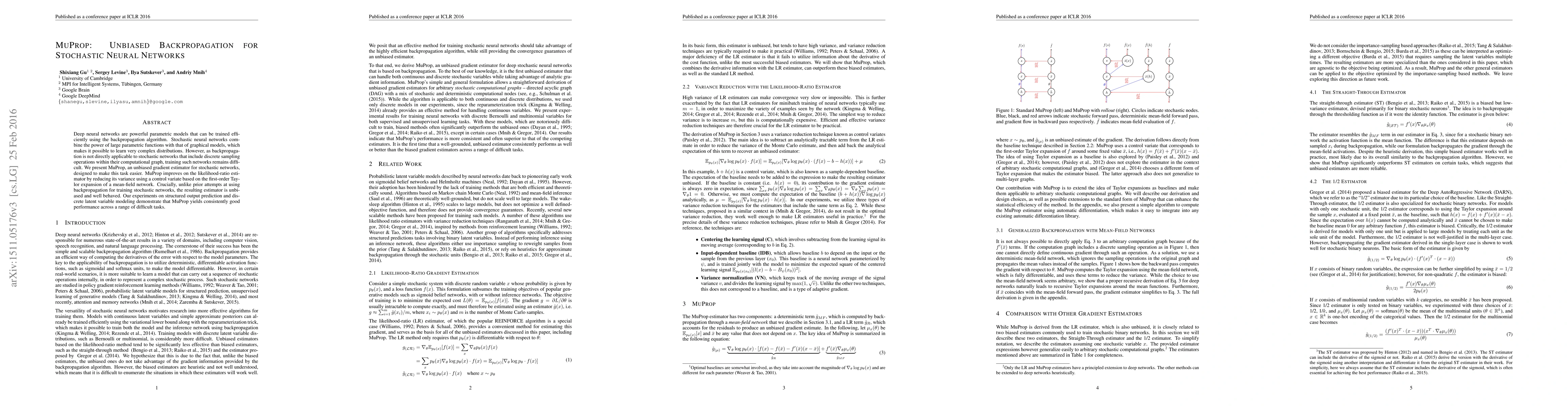 MuProp introduces an unbiased gradient estimator for training stochastic neural networks, overcoming the limitations of backpropagation in networks with discrete sampling. This method significantly reduces variance compared to previous likelihood-ratio estimators, leading to improved performance in structured output prediction and discrete latent variable modeling.