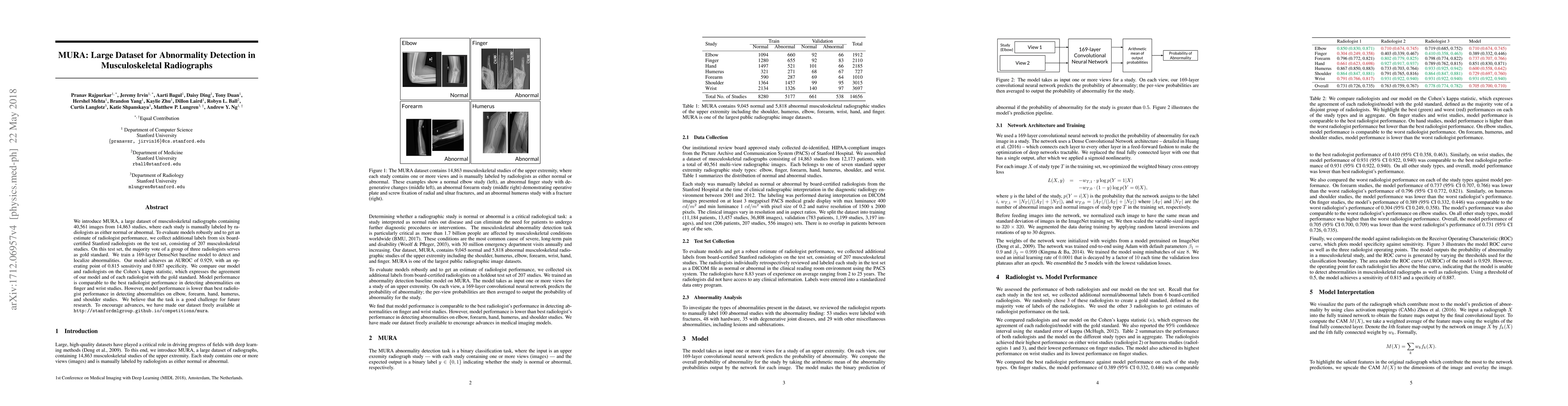 The MURA dataset comprises 40,561 musculoskeletal radiographs labeled by radiologists, with a test set evaluated by six radiologists to establish a gold standard. A 169-layer DenseNet model achieves competitive performance comparable to top radiologists in detecting abnormalities in finger and wrist studies but lags in other areas. The dataset is made freely available to spur further research.
