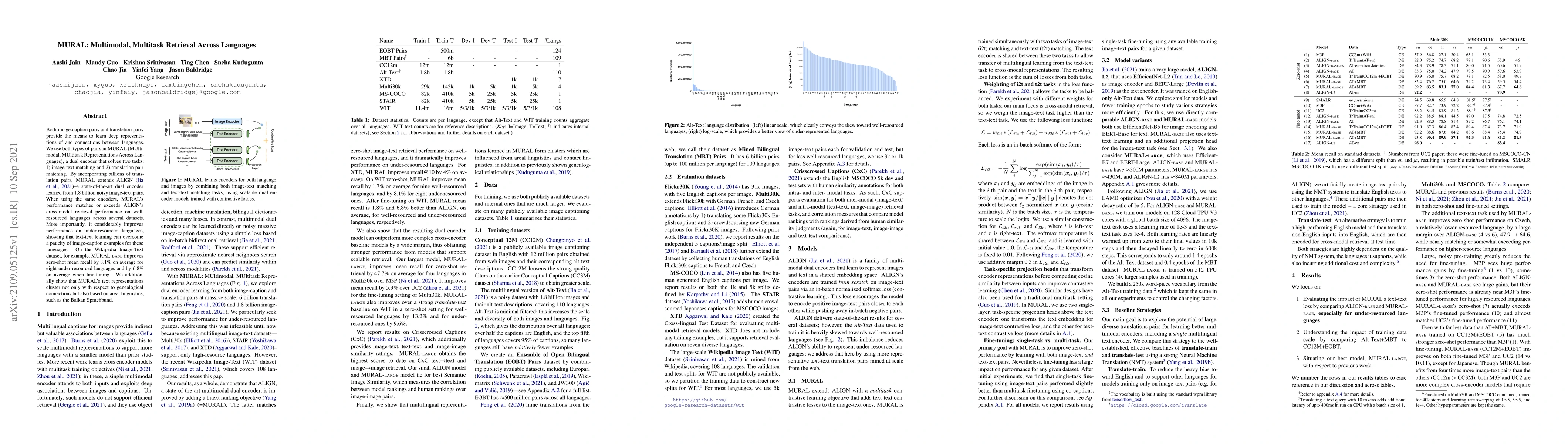 Both image-caption pairs and translation pairs provide the means to learn deep representations of and connections between languages. We use both types of pairs in MURAL (MUltimodal, MUltitask Representations Across Languages), a dual encoder that solves two tasks: 1) image-text matching and 2) translation pair matching. By incorporating billions of translation pairs, MURAL extends ALIGN (Jia et al. PMLR'21)--a state-of-the-art dual encoder learned from 1.8 billion noisy image-text pairs. When using the same encoders, MURAL's performance matches or exceeds ALIGN's cross-modal retrieval performance on well-resourced languages across several datasets. More importantly, it considerably improves performance on under-resourced languages, showing that text-text learning can overcome a paucity of image-caption examples for these languages. On the Wikipedia Image-Text dataset, for example, MURAL-base improves zero-shot mean recall by 8.1% on average for eight under-resourced languages and by 6.8% on average when fine-tuning. We additionally show that MURAL's text representations cluster not only with respect to genealogical connections but also based on areal linguistics, such as the Balkan Sprachbund.