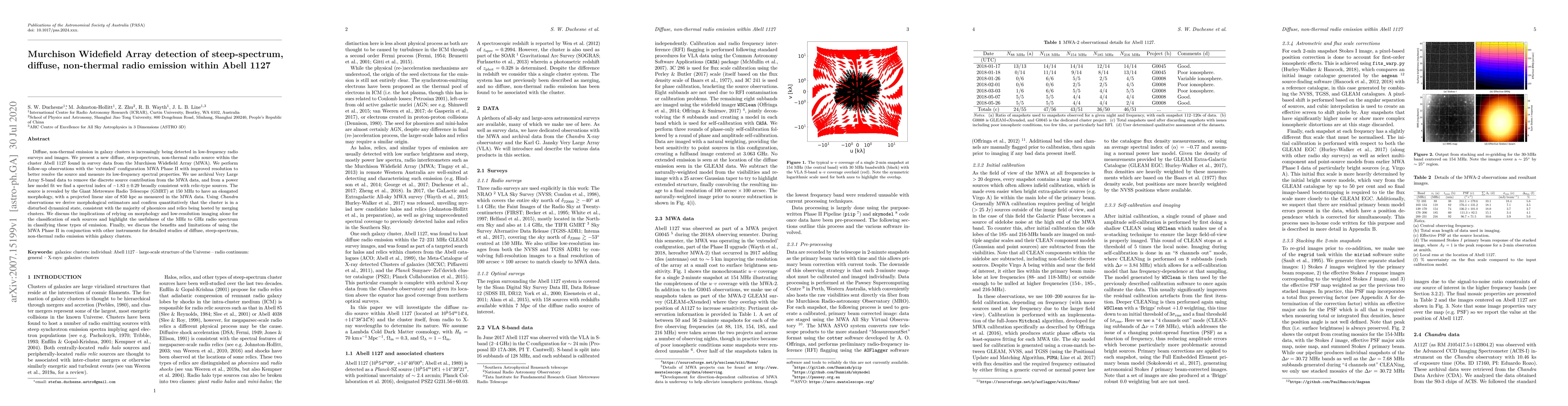 The Murchison Widefield Array detected a diffuse, steep-spectrum, non-thermal radio source in the Abell 1127 cluster, characterized by a spectral index of $-1.83\pm0.29$ indicative of a relic-type source. Follow-up observations with the MWA Phase II and the Giant Metrewave Radio Telescope reveal an elongated morphology and confirm the cluster's disturbed dynamical state.