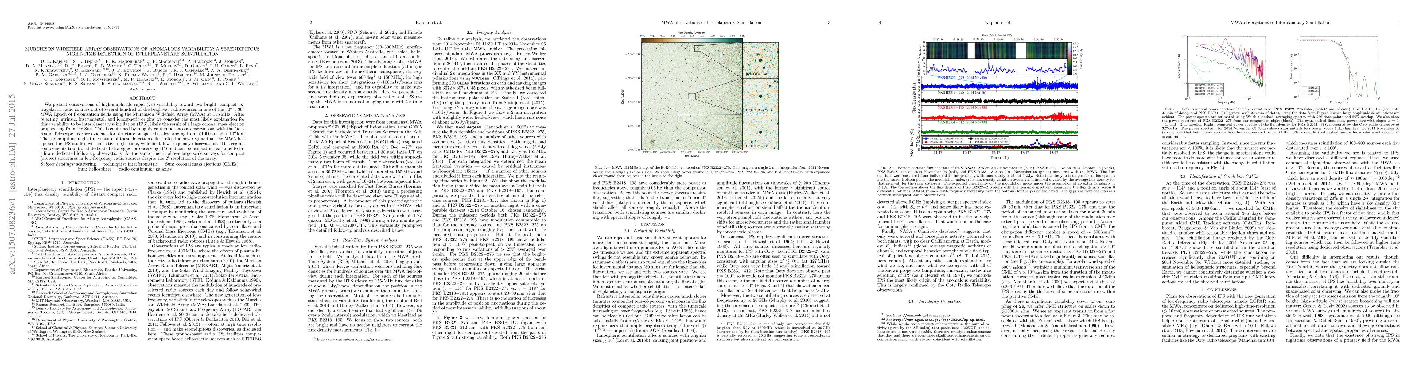 The Murchison Widefield Array detected high-amplitude rapid variability in two extragalactic radio sources, likely due to interplanetary scintillation from a coronal mass ejection. This serendipitous night-time observation opens a new regime for low-frequency, wide-field IPS studies.