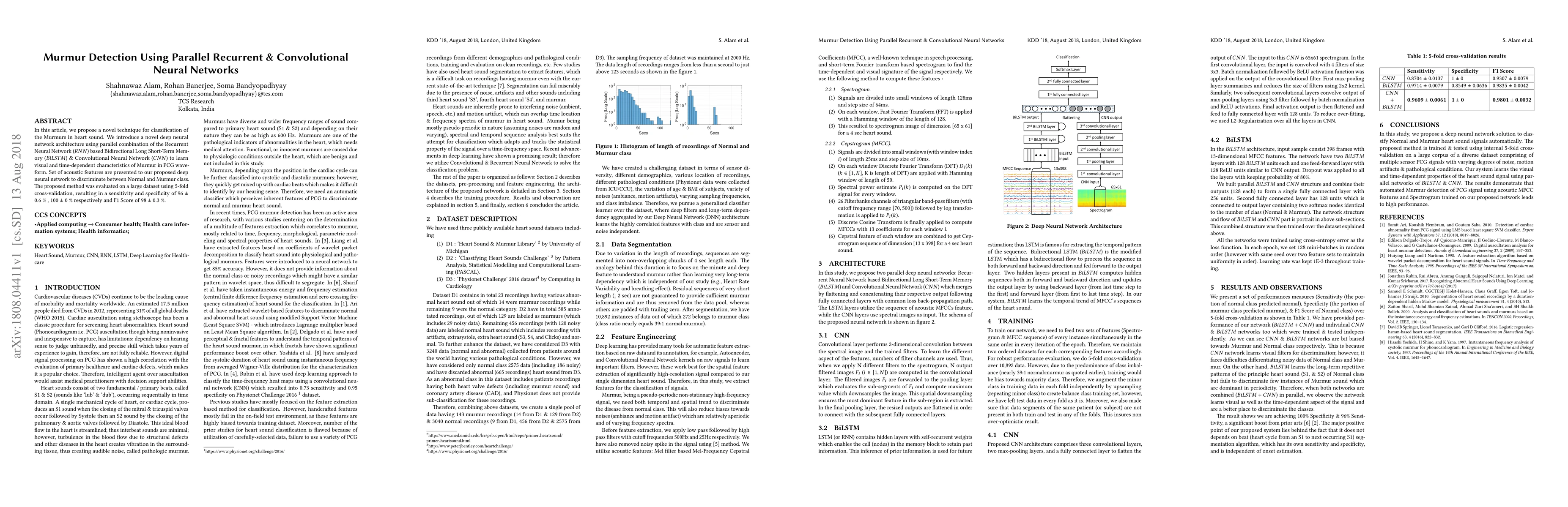 In this article, we propose a novel technique for classification of the Murmurs in heart sound. We introduce a novel deep neural network architecture using parallel combination of the Recurrent Neural Network (RNN) based Bidirectional Long Short-Term Memory (BiLSTM) & Convolutional Neural Network (CNN) to learn visual and time-dependent characteristics of Murmur in PCG waveform. Set of acoustic features are presented to our proposed deep neural network to discriminate between Normal and Murmur class. The proposed method was evaluated on a large dataset using 5-fold cross-validation, resulting in a sensitivity and specificity of 96 +- 0.6 % , 100 +- 0 % respectively and F1 Score of 98 +- 0.3 %.