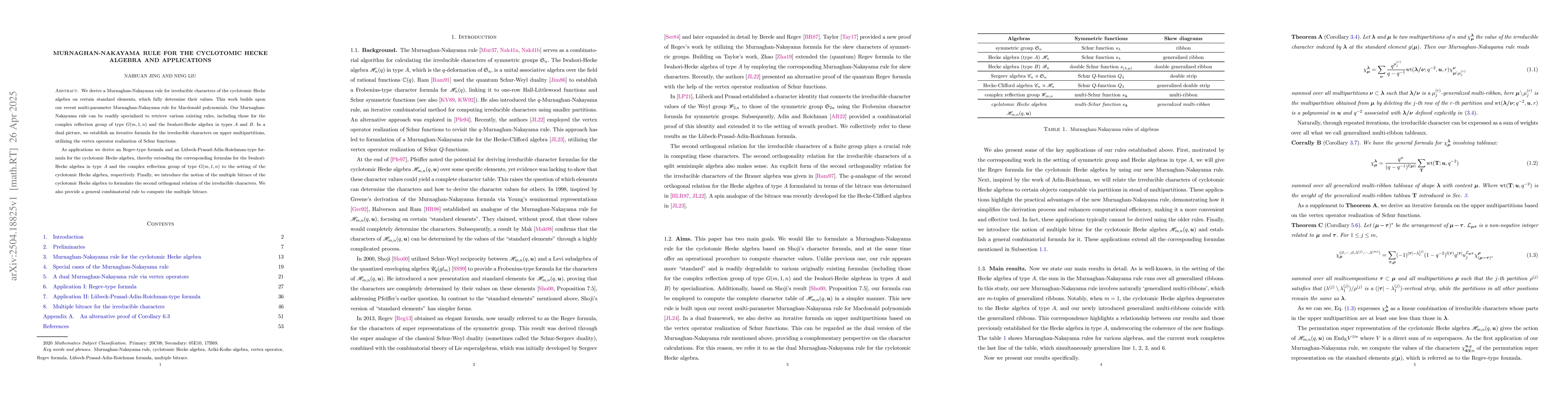 The paper presents a novel Murnaghan-Nakayama rule for the cyclotomic Hecke algebra and establishes connections to existing rules for related algebras, along with new character formulas and the introduction of multiple bitrace.