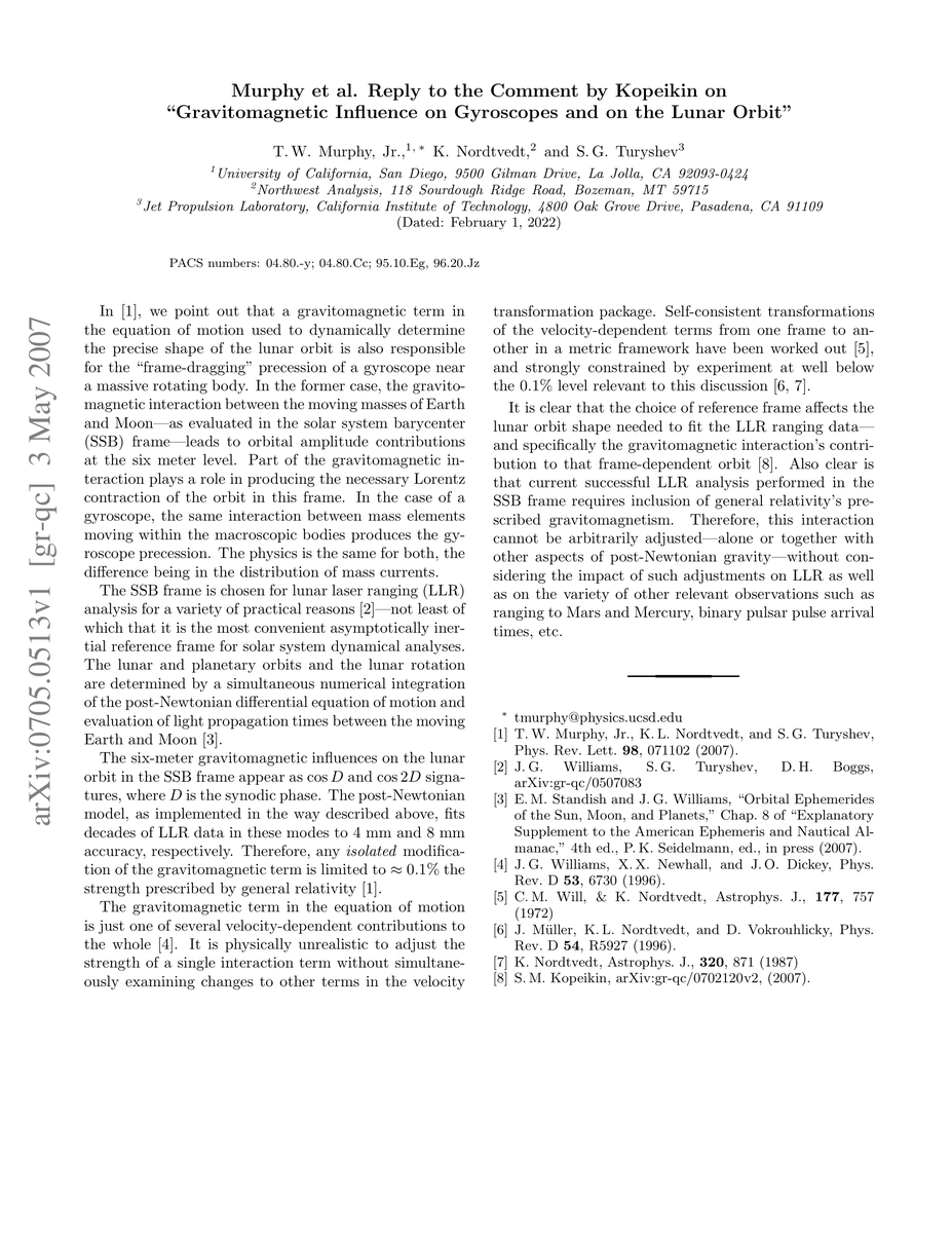 Murphy et al. respond to Kopeikin's comment, reaffirming that lunar laser ranging data necessitates the inclusion of the gravitomagnetic term as predicted by general relativity to maintain consistency with observations. Any alteration to this term must preserve the accuracy of the lunar orbit and gyroscope measurements.