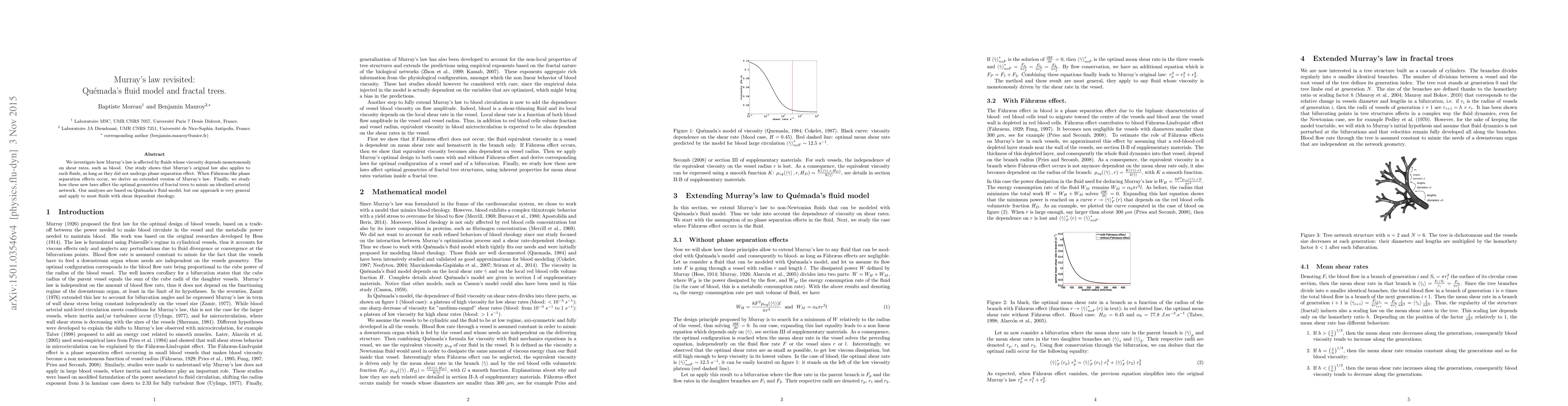 This paper revisits Murray's law for optimal blood vessel design, extending it to account for non-Newtonian fluid properties and shear-dependent viscosity. It shows that Murray's law remains valid for Qu\'emada's fluid model, except when phase separation occurs, in which case an extended version is derived.