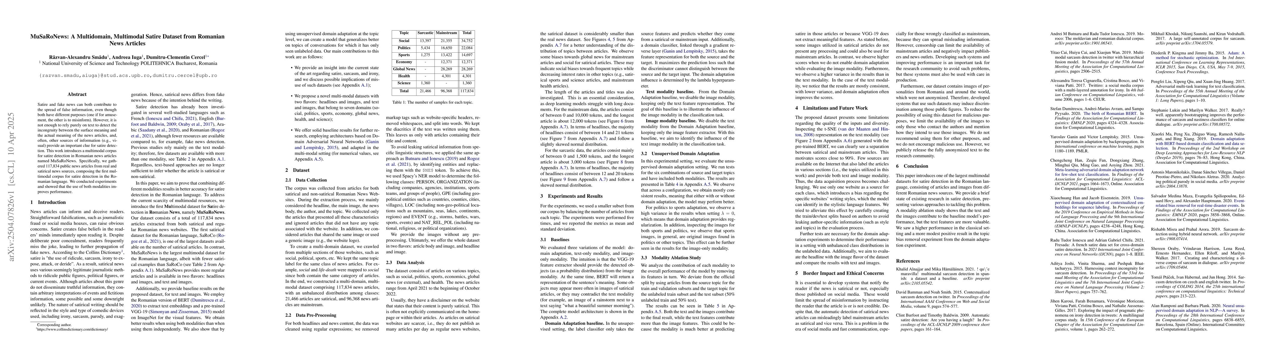 This research introduces MuSaRoNews, a multimodal corpus for Romanian satire detection, comprising 117,834 news articles from real and satirical sources. It combines text and image modalities to improve performance in distinguishing satire from genuine news.