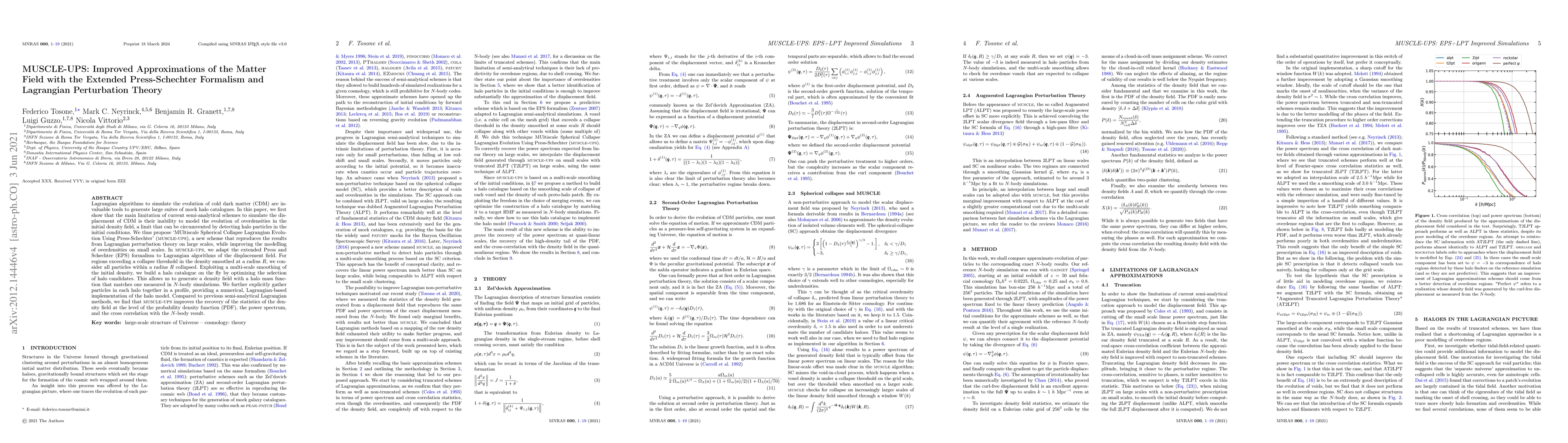 The paper introduces MUSCLE-UPS, an improved scheme to simulate the evolution of cold dark matter using Lagrangian perturbation theory, which better models overdensities in the initial density field compared to existing semi-analytical methods. MUSCLE-UPS employs a multi-scale spherical collapse approach based on the extended Press-Schechter formalism to generate accurate halo catalogues that match $N$-body simulations in density field statistics.