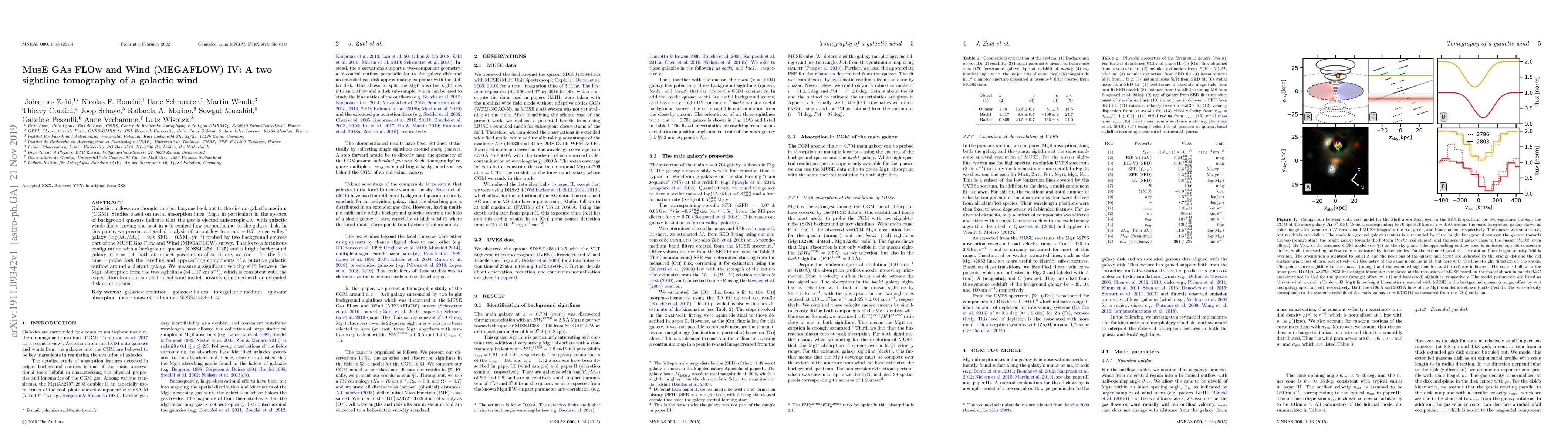 This paper presents a detailed analysis of a galactic outflow using two sightlines from the MUSE Gas Flow and Wind (MEGAFLOW) survey, revealing a significant velocity shift in MgII absorption lines indicative of anisotropic ejection. The study probes both the receding and approaching components of the outflow, providing new insights into the bi-conical flow of galactic winds.