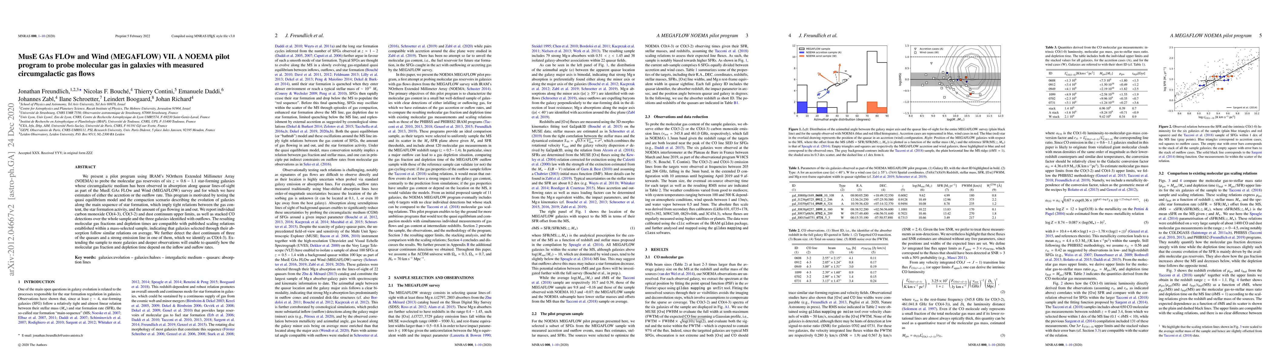 We present a pilot program using IRAM's NOrthern Extended Millimeter Array (NOEMA) to probe the molecular gas reservoirs of six $z=0.6-1.1$ star-forming galaxies whose circumgalactic medium has been observed in absorption along quasar lines-of-sight as part of the MusE GAs FLOw and Wind (MEGAFLOW) survey and for which we have estimates of either the accretion or the outflow rate. This program is motivated by testing the quasi equilibrium model and the compaction scenario describing the evolution of galaxies along the main sequence of star formation, which imply tight relations between the gas content, the star formation activity, and the amount of gas flowing in and out. We report individual carbon monoxide CO(4-3), CO(3-2) and dust continuum upper limits, as well as stacked CO detections over the whole sample and the three galaxies identified with outflows. The resulting molecular gas fractions and depletion times are compatible with published scaling relations established within a mass-selected sample, indicating that galaxies selected through their absorption follow similar relations on average. We further detect the dust continuum of three of the quasars and a strong emission line in one of them, which we identify as CO(4-3). Extending the sample to more galaxies and deeper observations will enable to quantify how the molecular gas fraction and depletion time depend on the inflow and ouflow rates.