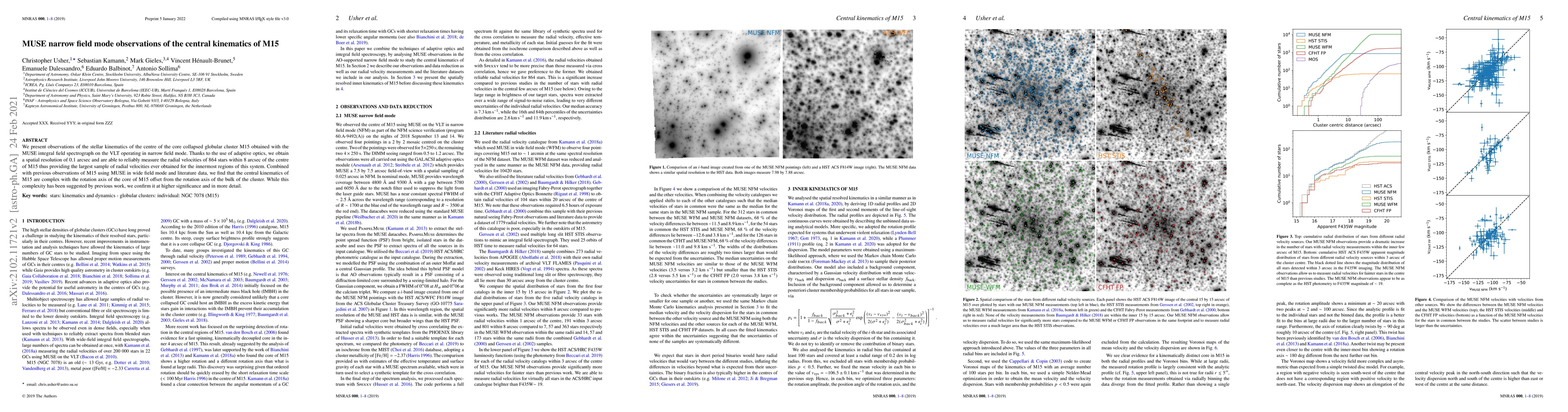 We present observations of the stellar kinematics of the centre of the core collapsed globular cluster M15 obtained with the MUSE integral field spectrograph on the VLT operating in narrow field mode. Thanks to the use of adaptive optics, we obtain a spatial resolution of 0.1arcsec and are able to reliably measure the radial velocities of 864 stars within 8 arcsec of the centre of M15 thus providing the largest sample of radial velocities ever obtained for the innermost regions of this system. Combined with previous observations of M15 using MUSE in wide field mode and literature data, we find that the central kinematics of M15 are complex with the rotation axis of the core of M15 offset from the rotation axis of the bulk of the cluster. While this complexity has been suggested by previous work, we confirm it at higher significance and in more detail.