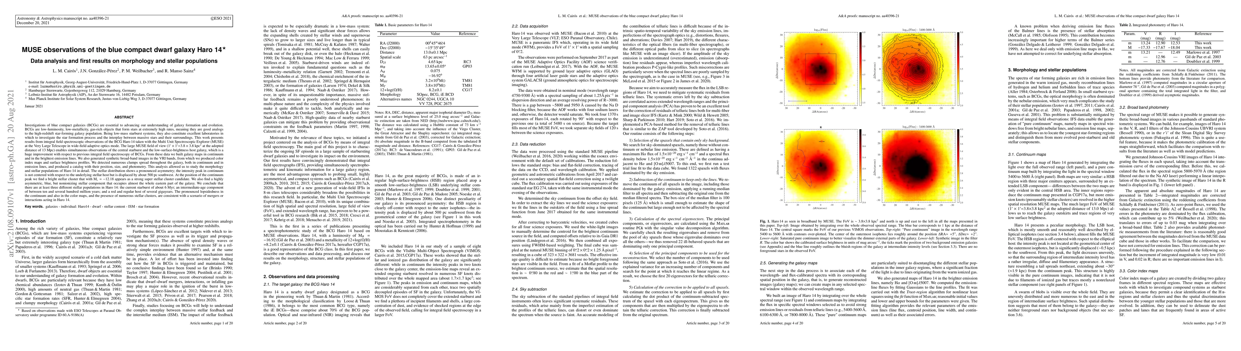 (Abriged) Blue compact galaxies (BCGs) are low-luminosity, metal-poor, gas-rich objects that form stars at high rates, excellent analogs to the high-redshift star-forming galaxy population. Being low-mass starbursts, they also constitute ideal laboratories for investigating star formation and massive stellar feedback. This work presents results from integral field spectroscopic observations of the BCG Haro 14 taken with the Multi Unit Spectroscopic Explorer (MUSE). The large MUSE field of view enables simultaneous observations of the starburst and the host galaxy. We built galaxy maps in continuum and in emission lines and generated synthetic VRI images, from which we produced color index maps and surface brightness profiles. We detected numerous clumps spread throughout the galaxy, both in continuum and in emission lines, and produced a catalog with their position, size, and photometry. This analysis allowed us to study the morphology and stellar populations of Haro 14 in detail. The stellar distribution shows a pronounced asymmetry; the intensity peak in continuum is not centered with respect to the stellar host but is displaced by about 500 pc southwest. At the position of the continuum peak we find a bright stellar cluster that with M$_{V}=-12.18$ appears as a strong super stellar cluster candidate. We also find a highly asymmetric, blue, but nonionizing stellar component that occupies almost the whole eastern part of the galaxy. We conclude that there are at least three different stellar populations in Haro 14: the current starburst of about 6 Myr; an intermediate-age component of between ten and several hundred million years; and a red and regular host of several gigayears. The pronounced lopsidedness in the continuum and also in the color maps, and the presence of numerous stellar clusters, are consistent with a scenario of mergers or interactions acting in Haro 14.