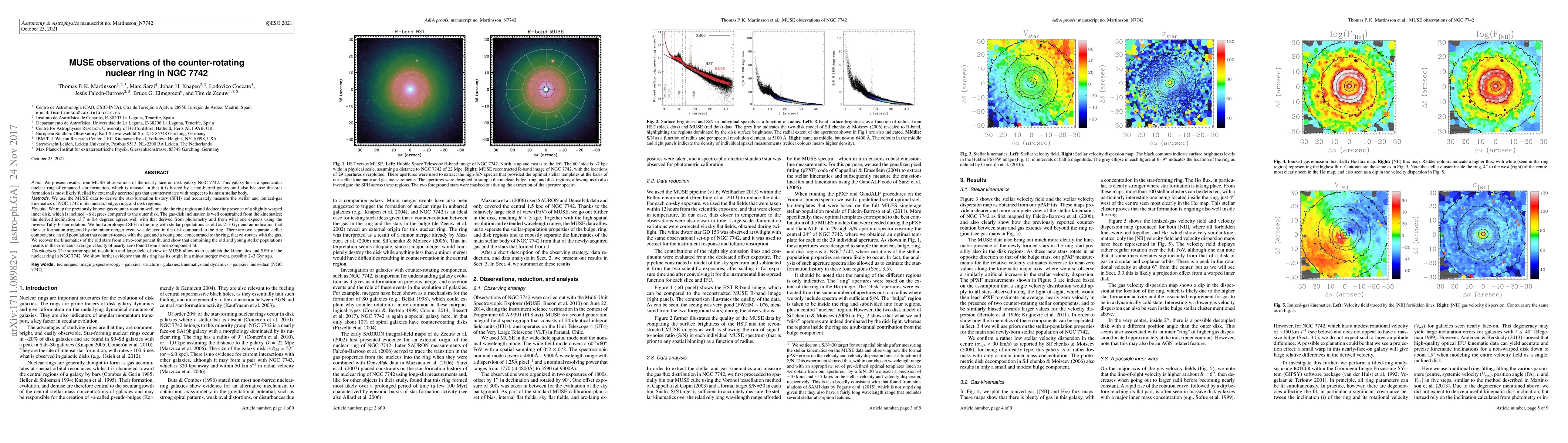 We present results from MUSE observations of the nearly face-on disk galaxy NGC 7742. This galaxy hosts a spectacular nuclear ring of enhanced star formation, which is unusual in that it is hosted by a non-barred galaxy, and also because this star formation is most likely fuelled by externally accreted gas that counter-rotates with respect to its main stellar body. We use the MUSE data to derive the star-formation history (SFH) and accurately measure the stellar and ionized-gas kinematics of NGC7742 in its nuclear, bulge, ring, and disk regions. We map the previously known gas counter-rotation well outside the ring region and deduce the presence of a slightly warped inner disk, which is inclined ~6 degrees compared to the outer disk. The gas-disk inclination is well constrained from the kinematics; the derived inclination 13.7 $\pm$ 0.4 degrees agrees well with that derived from photometry and from what one expects using the inverse Tully-Fisher relation. We find a prolonged SFH in the ring with stellar populations as old as 2-3 Gyr and an indication that the star formation triggered by the minor merger event was delayed in the disk compared to the ring. There are two separate stellar components: an old population that counter-rotates with the gas, and a young one, concentrated to the ring, that co-rotates with the gas. We recover the kinematics of the old stars from a two-component fit, and show that combining the old and young stellar populations results in the erroneous average velocity of nearly zero found from a one-component fit. The superior spatial resolution and large field of view of MUSE allow us to establish the kinematics and SFH of the nuclear ring in NGC 7742. We show further evidence that this ring has its origin in a minor merger event, possibly 2-3 Gyr ago.