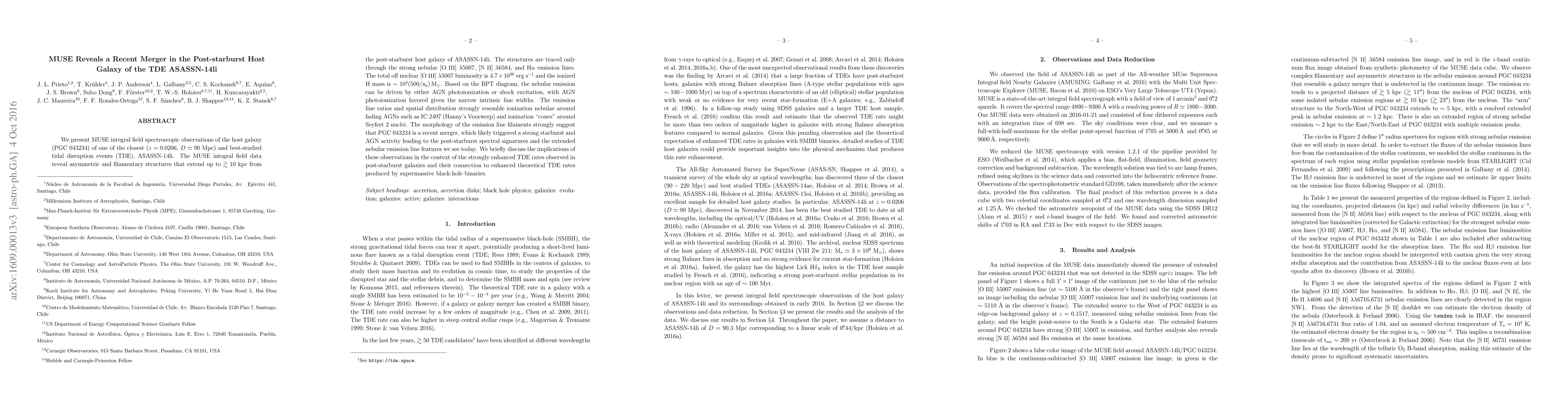 The MUSE observations of the host galaxy of the TDE ASASSN-14li reveal asymmetric, filamentary structures extending up to 10 kpc, suggesting a recent merger that triggered a starburst and AGN activity, leading to the observed nebular emission lines and post-starburst spectral signatures. The findings imply a connection between enhanced TDE rates in post-starburst galaxies and supermassive black-hole binaries.
