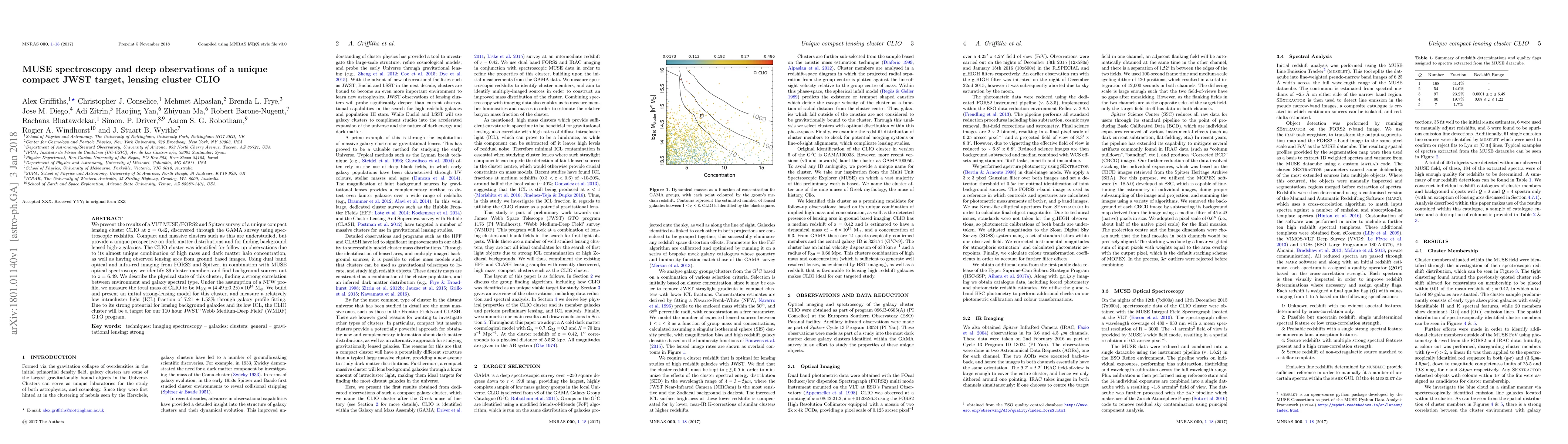 We present the results of a VLT MUSE/FORS2 and Spitzer survey of a unique compact lensing cluster CLIO at z = 0.42, discovered through the GAMA survey using spectroscopic redshifts. Compact and massive clusters such as this are understudied, but provide a unique prospective on dark matter distributions and for finding background lensed high-z galaxies. The CLIO cluster was identified for follow up observations due to its almost unique combination of high mass and dark matter halo concentration, as well as having observed lensing arcs from ground based images. Using dual band optical and infra-red imaging from FORS2 and Spitzer, in combination with MUSE optical spectroscopy we identify 89 cluster members and find background sources out to z = 6.49. We describe the physical state of this cluster, finding a strong correlation between environment and galaxy spectral type. Under the assumption of a NFW profile, we measure the total mass of CLIO to be M$_{200} = (4.49 \pm 0.25) \times 10^{14}$ M$_\odot$. We build and present an initial strong-lensing model for this cluster, and measure a relatively low intracluster light (ICL) fraction of 7.21 $\pm$ 1.53% through galaxy profile fitting. Due to its strong potential for lensing background galaxies and its low ICL, the CLIO cluster will be a target for our 110 hour JWST 'Webb Medium-Deep Field' (WMDF) GTO program.