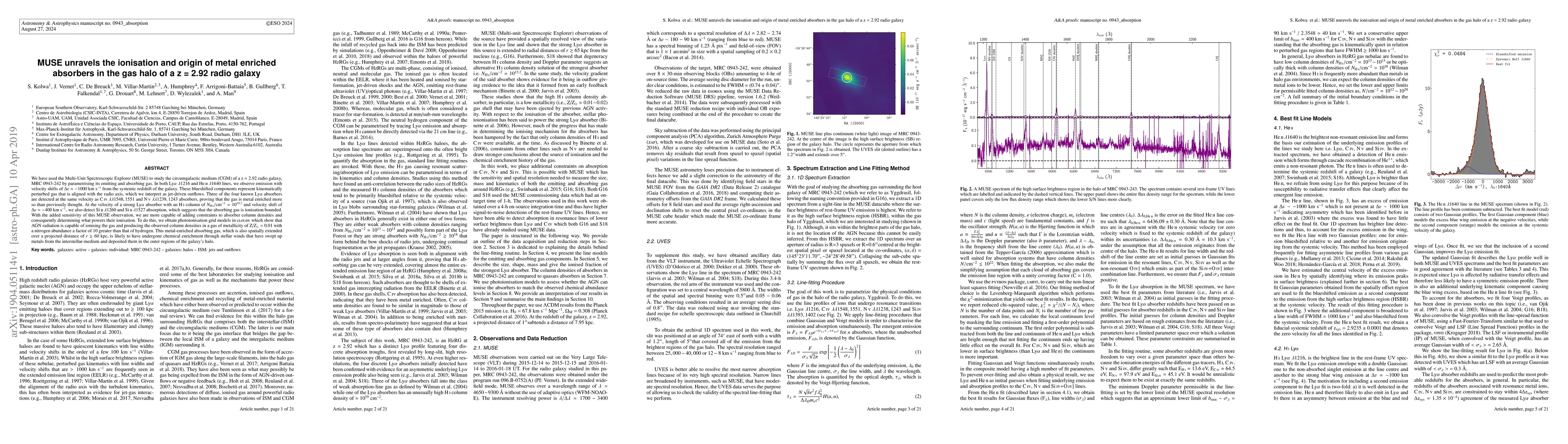 The MUSE study of the z = 2.92 radio galaxy MRC 0943-242 reveals metal-enriched gas outflows aligned with the radio axis, suggesting jet-driven perturbations. The metal-enriched absorbing gas, detected in Ly$\alpha$, C IV, and N V lines, is likely enriched by stellar winds depositing metals from the interstellar medium into the galaxy's halo.