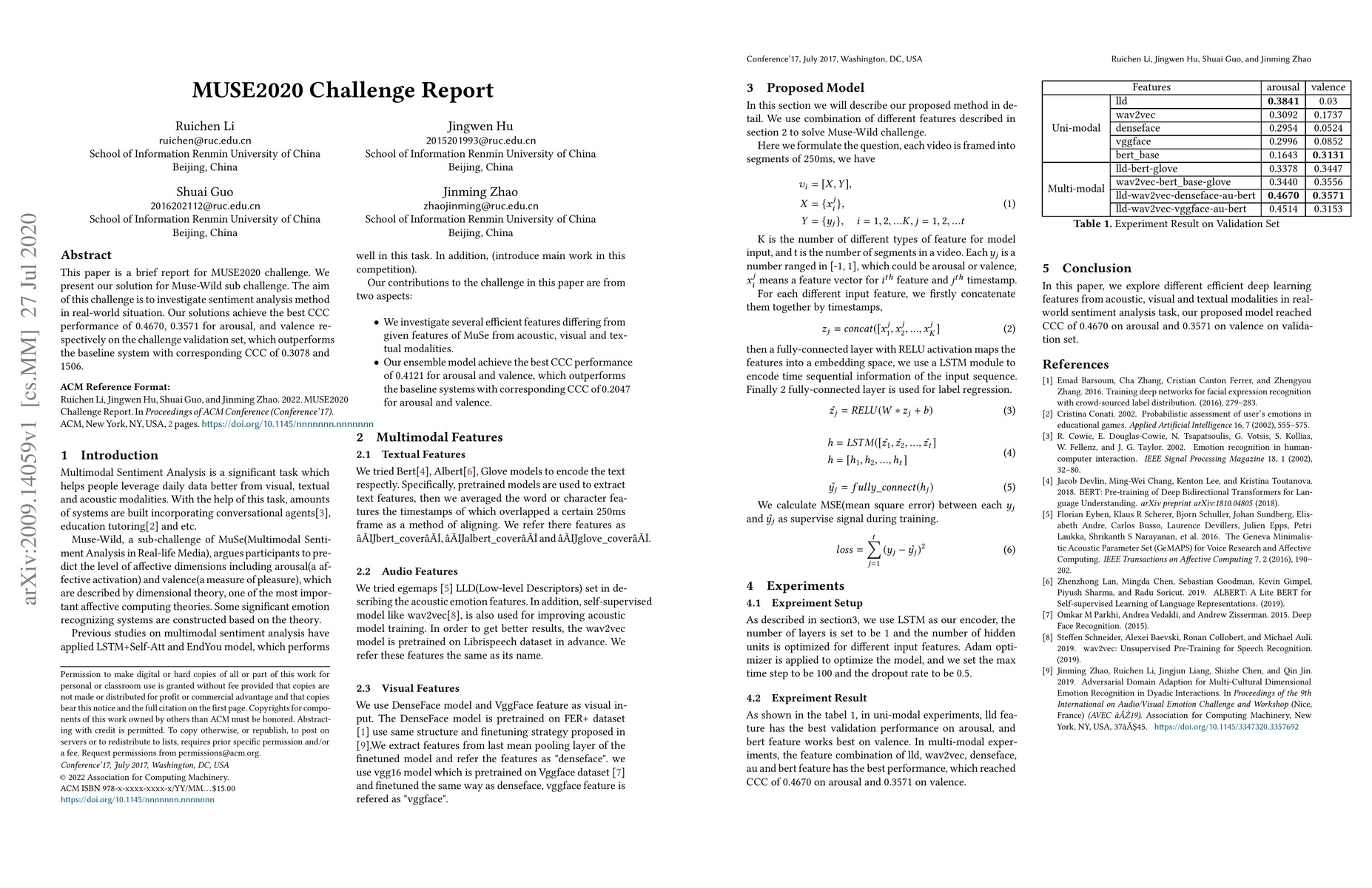 This paper reports on the MUSE2020 challenge, focusing on the Muse-Wild sub challenge, where the authors achieved top performance in sentiment analysis with CCC scores of 0.4670 for arousal and 0.3571 for valence, outperforming the baseline system.