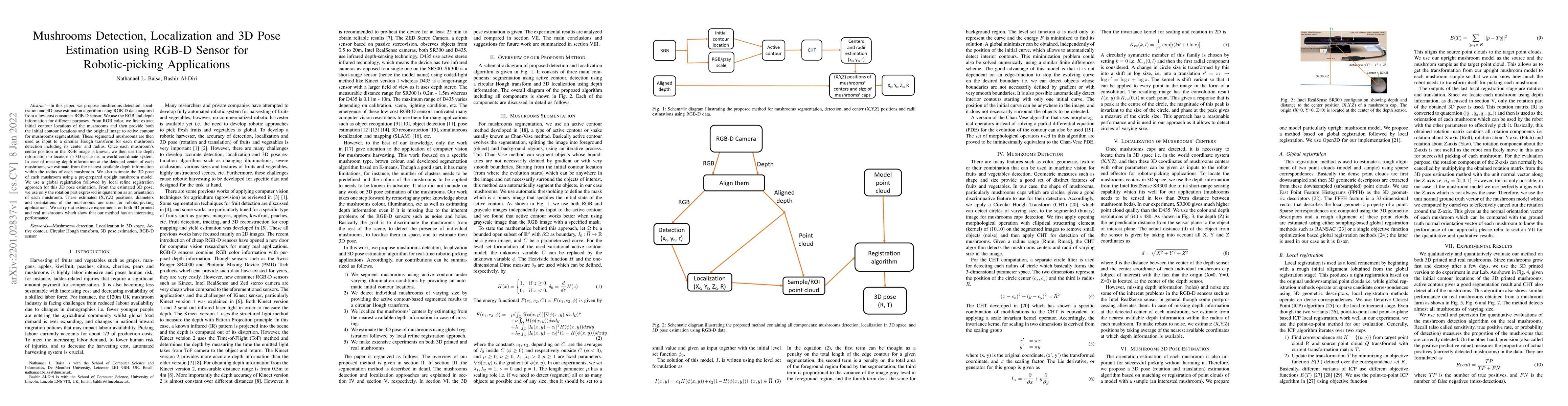 This paper proposes an RGB-D sensor-based algorithm for detecting, localizing, and estimating 3D poses of mushrooms for robotic-picking applications. It uses RGB data for initial contour extraction and segmentation, and depth data for 3D localization and pose estimation, achieving promising results on both synthetic and real mushrooms.
