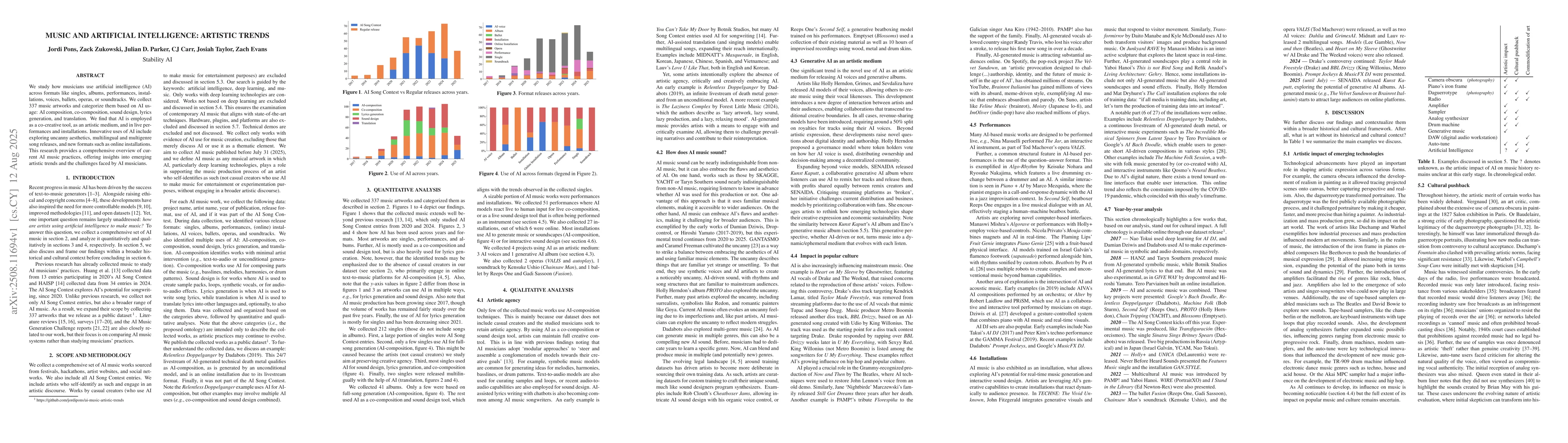 We study how musicians use artificial intelligence (AI) across formats like singles, albums, performances, installations, voices, ballets, operas, or soundtracks. We collect 337 music artworks and categorize them based on AI usage: AI composition, co-composition, sound design, lyrics generation, and translation. We find that AI is employed as a co-creative tool, as an artistic medium, and in live performances and installations. Innovative uses of AI include exploring uncanny aesthetics, multilingual and multigenre song releases, and new formats such as online installations. This research provides a comprehensive overview of current AI music practices, offering insights into emerging artistic trends and the challenges faced by AI musicians.
