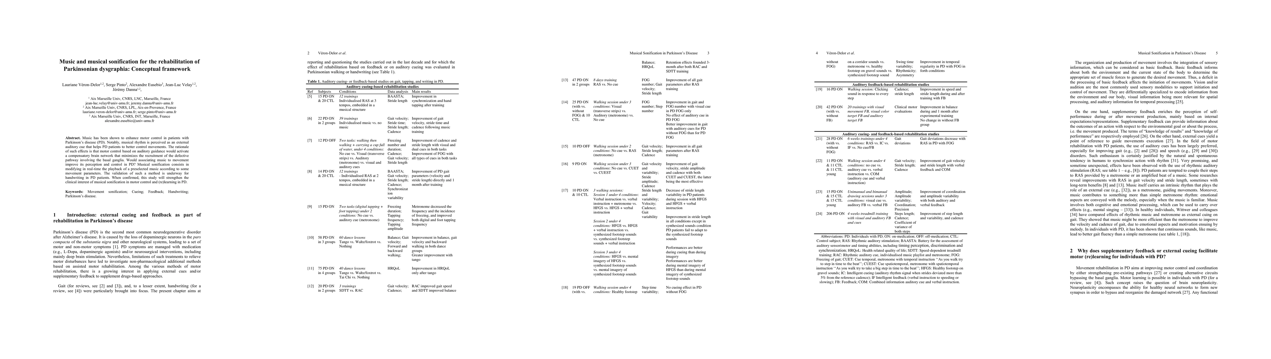 This paper explores how musical sonification, which adapts music in real-time based on movement parameters, could enhance motor control and handwriting in Parkinson's disease patients. It aims to validate the potential of this method to activate compensatory brain networks, offering a promising rehabilitation approach for Parkinsonian dysgraphia.