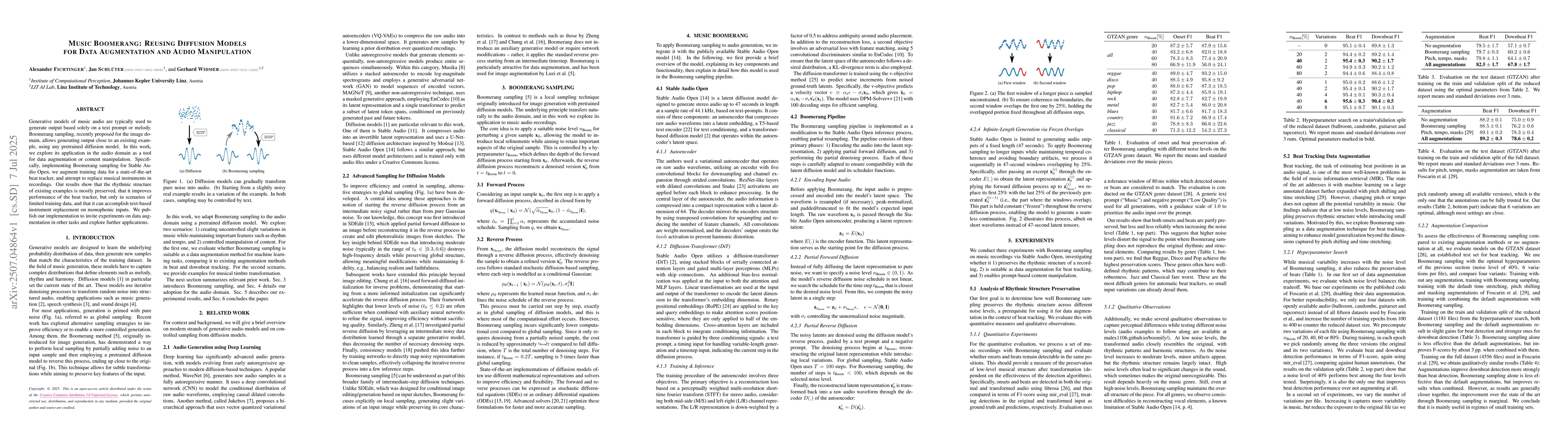 The research adapts Boomerang sampling [5] to the audio domain using StableAudioOpen [14], a pre-trained diffusion model. It explores data augmentation for beat tracking and controlled audio manipulation via text prompts.