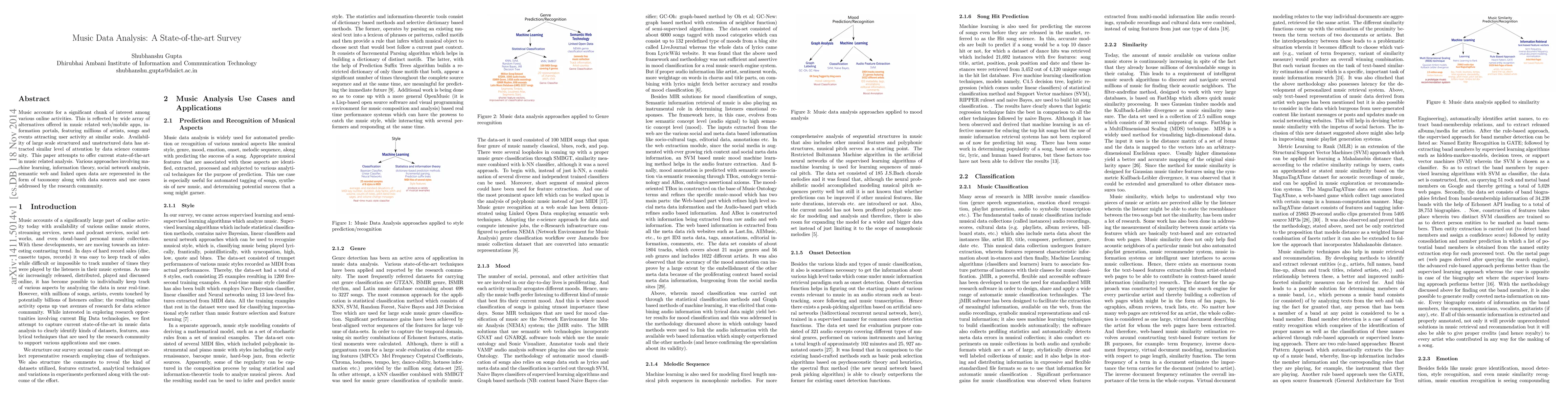 This paper surveys the current state-of-the-art in music data analysis, categorizing various approaches including machine learning, information theory, and social network analysis, and highlighting data sources and use cases in the music domain.