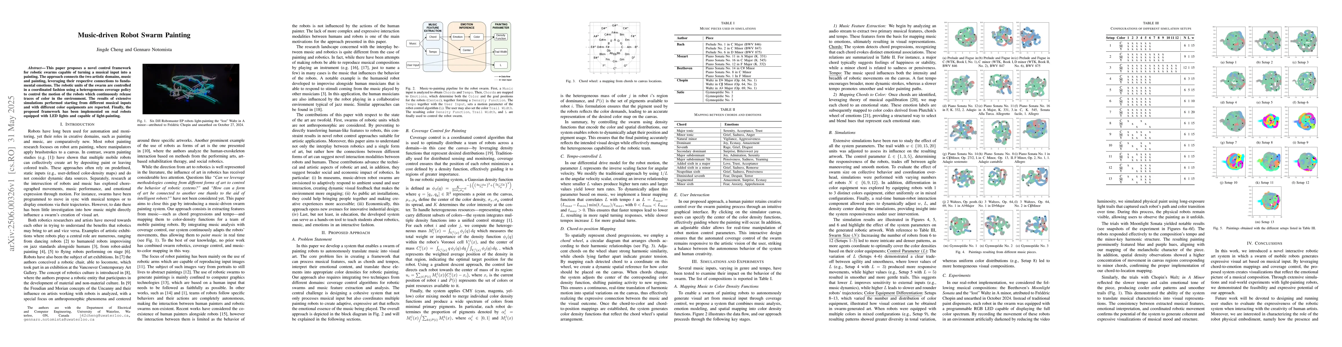 A new control framework for robotic swarms uses musical input to create paintings, leveraging emotional connections between music and art. The system was successfully implemented on real robots using LED lights, demonstrating a novel intersection of art and technology.