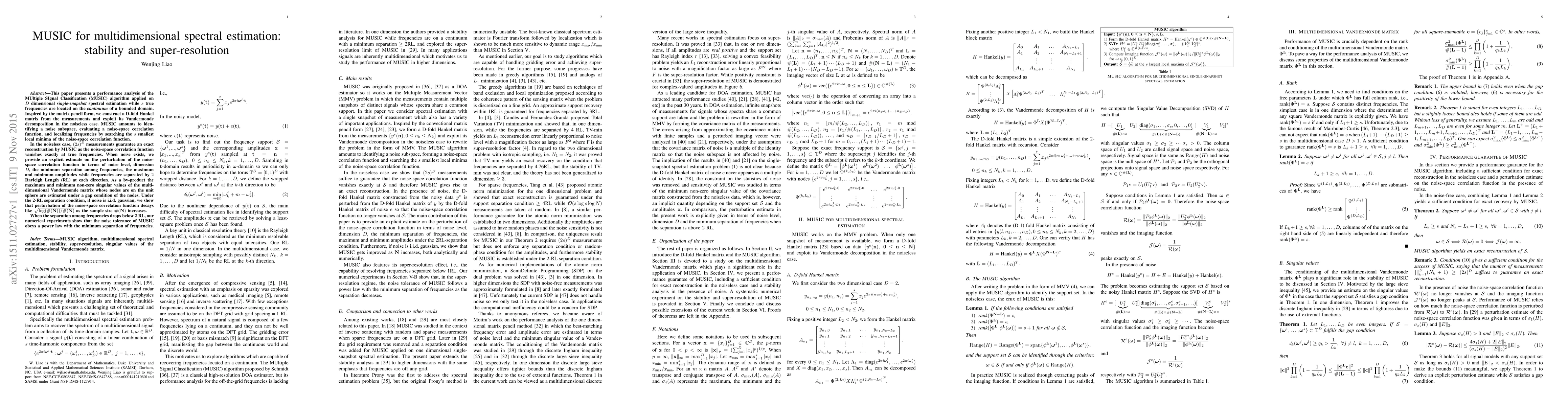 This paper analyzes the performance of the MUSIC algorithm for multidimensional spectral estimation, demonstrating its exact reconstruction capability in noiseless scenarios and providing a noise-perturbation estimate in noisy conditions. It shows that MUSIC's noise tolerance follows a power law when frequency separations fall below a certain threshold.