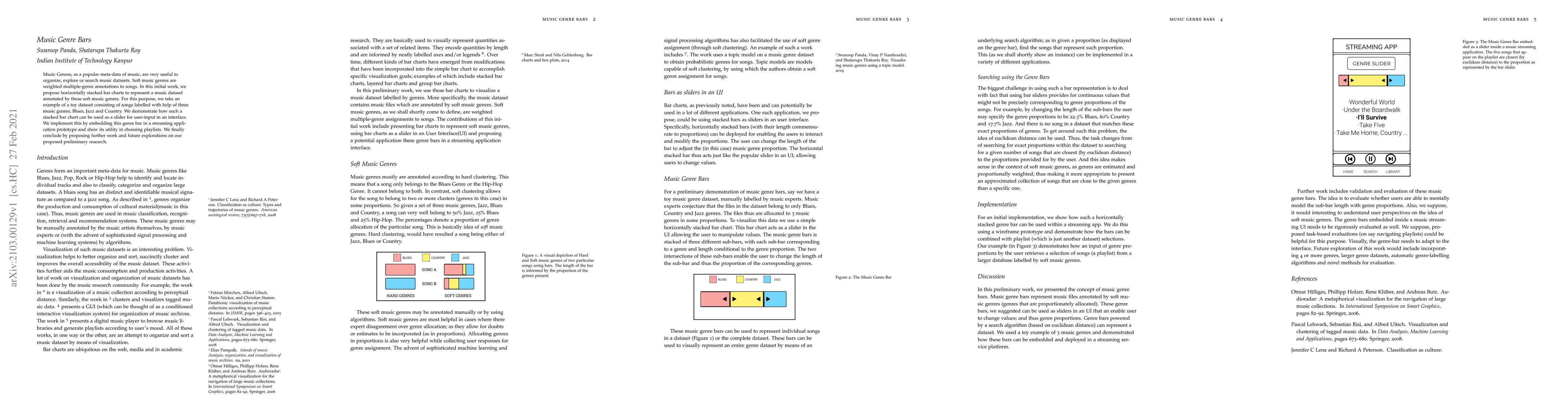 Music Genres, as a popular meta-data of music, are very useful to organize, explore or search music datasets. Soft music genres are weighted multiple-genre annotations to songs. In this initial work, we propose horizontally stacked bar charts to represent a music dataset annotated by these soft music genres. For this purpose, we take an example of a toy dataset consisting of songs labelled with help of three music genres; Blues, Jazz and Country. We demonstrate how such a stacked bar chart can be used as a slider for user-input in an interface. We implement this by embedding this genre bar in a streaming application prototype and show its utility in choosing playlists. We finally conclude by proposing further work and future explorations on our proposed preliminary research.