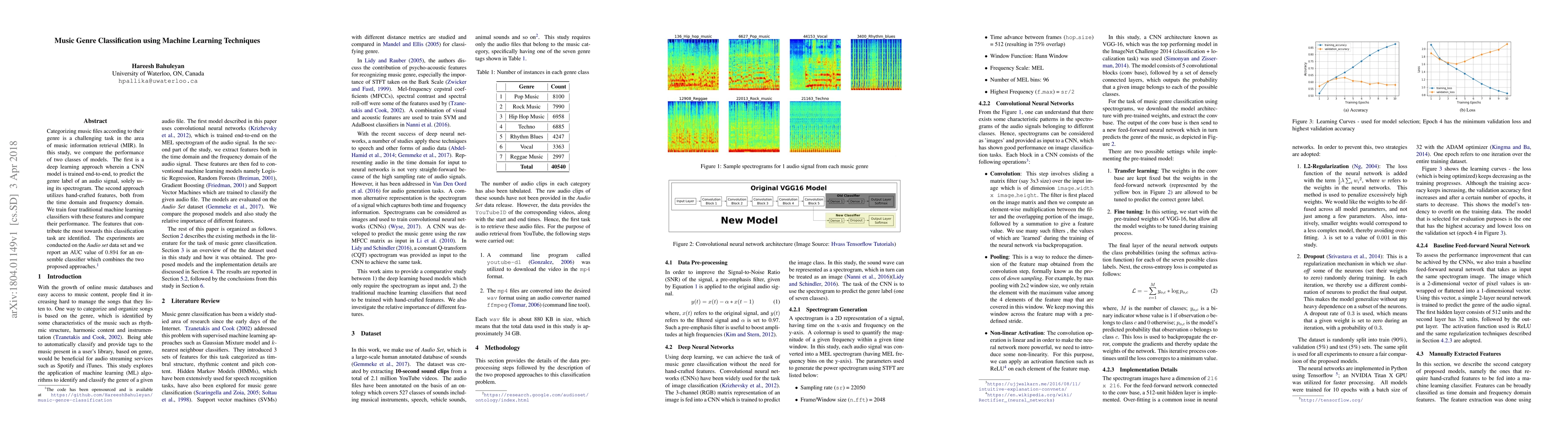 This research investigates the classification of music genres using machine learning techniques, comparing deep learning with traditional methods. The study employs a CNN model for deep learning and hand-crafted features for traditional machine learning classifiers, achieving an AUC value of 0.894 with an ensemble approach combining both methods. For more details, refer directly to the original paper.