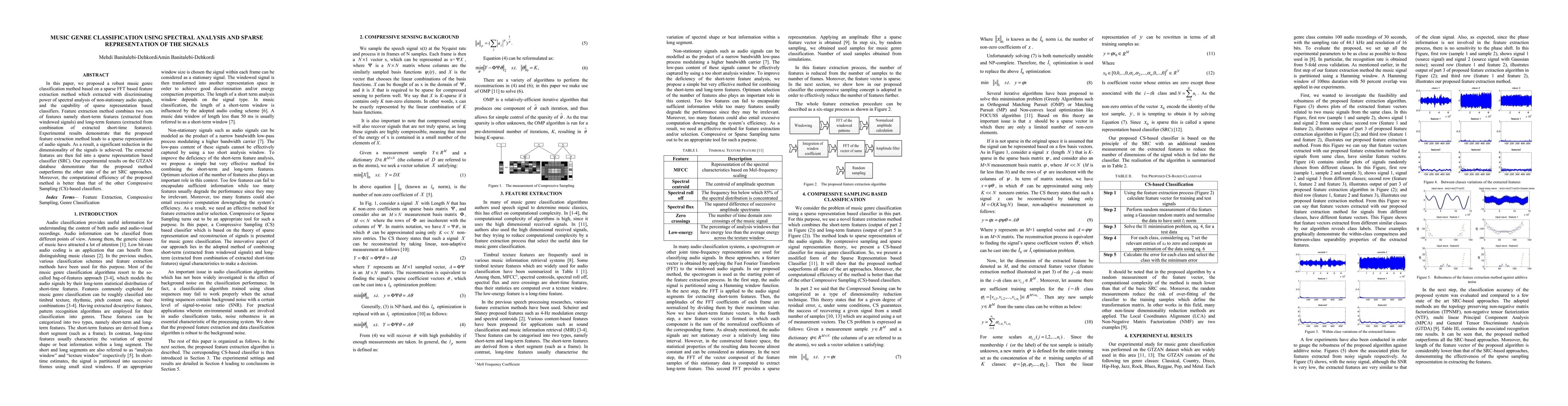 In this paper, we proposed a robust music genre classification method based on a sparse FFT based feature extraction method which extracted with discriminating power of spectral analysis of non-stationary audio signals, and the capability of sparse representation based classifiers. Feature extraction method combines two sets of features namely short-term features (extracted from windowed signals) and long-term features (extracted from combination of extracted short-time features). Experimental results demonstrate that the proposed feature extraction method leads to a sparse representation of audio signals. As a result, a significant reduction in the dimensionality of the signals is achieved. The extracted features are then fed into a sparse representation based classifier (SRC). Our experimental results on the GTZAN database demonstrate that the proposed method outperforms the other state of the art SRC approaches. Moreover, the computational efficiency of the proposed method is better than that of the other Compressive Sampling (CS)-based classifiers.