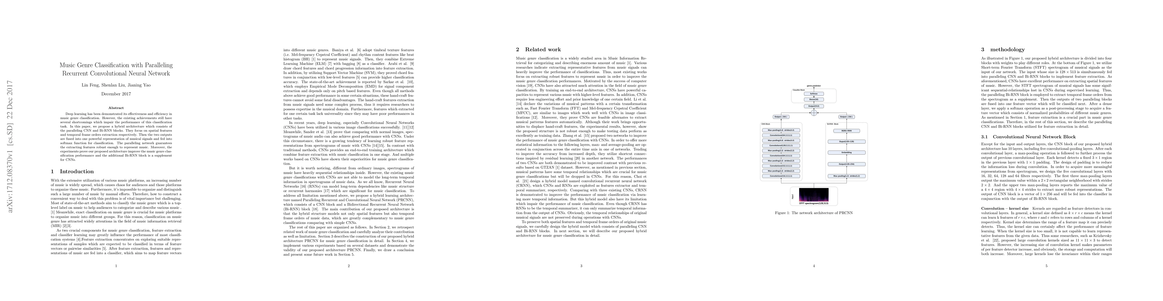 Deep learning has been demonstrated its effectiveness and efficiency in music genre classification. However, the existing achievements still have several shortcomings which impair the performance of this classification task. In this paper, we propose a hybrid architecture which consists of the paralleling CNN and Bi-RNN blocks. They focus on spatial features and temporal frame orders extraction respectively. Then the two outputs are fused into one powerful representation of musical signals and fed into softmax function for classification. The paralleling network guarantees the extracting features robust enough to represent music. Moreover, the experiments prove our proposed architecture improve the music genre classification performance and the additional Bi-RNN block is a supplement for CNNs.