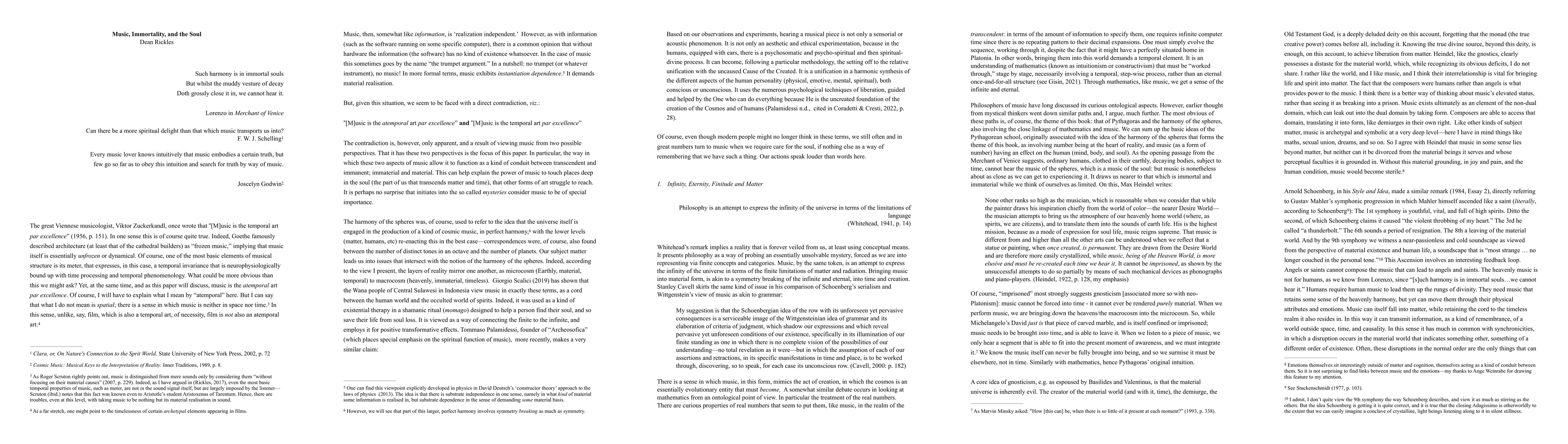 Music has been called the temporal art par excellence. Yet, as this paper explains, it is also the atemporal art par excellence. The contradiction is, however, only apparent, and a result of viewing music from two possible perspectives. That it has these two perspectives is the focus of this paper. In particular, the way in which these two aspects of music allow it to function as a kind of conduit between transcendent and immanent; immaterial and material. This can help explain the power of music to touch places deep in the soul (the part of us that transcends matter and time), that other forms of art struggle to reach. A somewhat similar debate occurs in looking at mathematics from an ontological point of view. In particular the treatment of the real numbers. There are curious properties of real numbers that seem to put them, like music, in the realm of the transcendent: in terms of the amount of information to specify them, one requires infinite computer time since there is no repeating pattern to their decimal expansions. One must simply evolve the sequence, working through it, despite the fact that it might have a perfectly situated home in Platonia. In other words, bringing them into this world demands a temporal element. We explore these and other links to a variety of issues in physics, ultimately arguing for dual-aspect monism.
