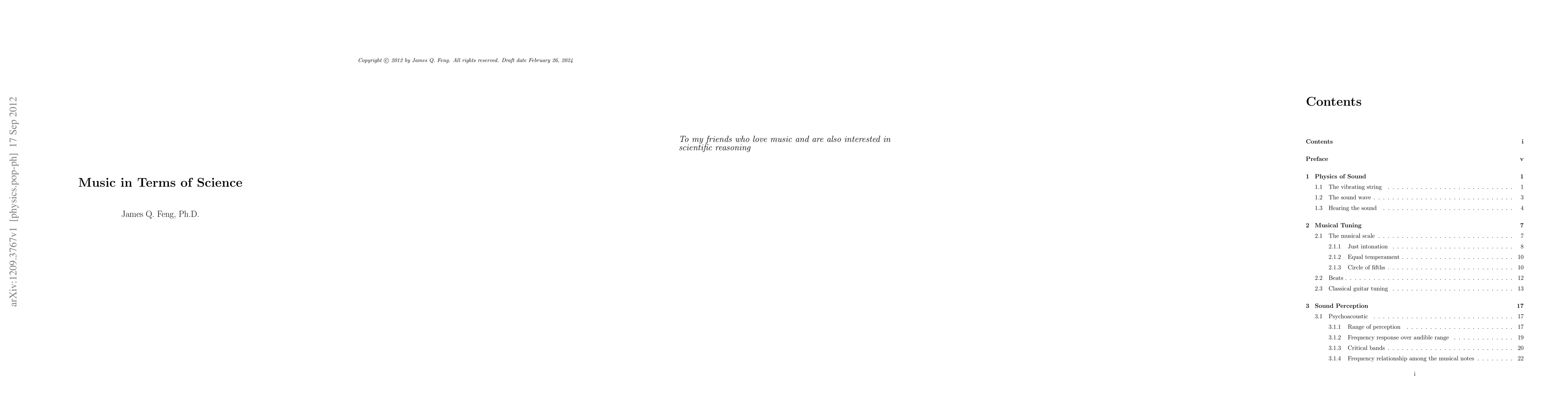 To many people, music is a mystery. It is uniquely human, because no other species produces elaborate, well organized sound for no particular reason. It has been part of every known civilization on earth. It has become a very part of man's need to impose his will upon the universe, to bring order out of chaos and to endow his moments of highest awareness with enduring form and substance. It is a form of art dealing with the organization of tones into patterns. Despite of cultural differences, music from different civilizations seems to consist of some building blocks that are universal: melody, harmony, rhythm, etc. Almost all musical systems are based on scales spanning an octave---the note that sounds the same as the one you started off with, but at a higher or lower pitch. It was discovered by Pythagoras, a Greek philosopher who lived around 500 BC, that the note an octave higher than another has a frequency twice high. The notes that sound harmonious together have simple rational number ratios between their frequencies. It is those implicit structures and relationships in apparently mysterious musical experience that I am interested in exploring here. As a scientist by training with a consistent passion for classical guitar playing, I would like make an attempt to explain the musical experience in terms of science and mathematics, hoping to fill some gaps between the knowledge of scientists and artistic intuition of musicians.