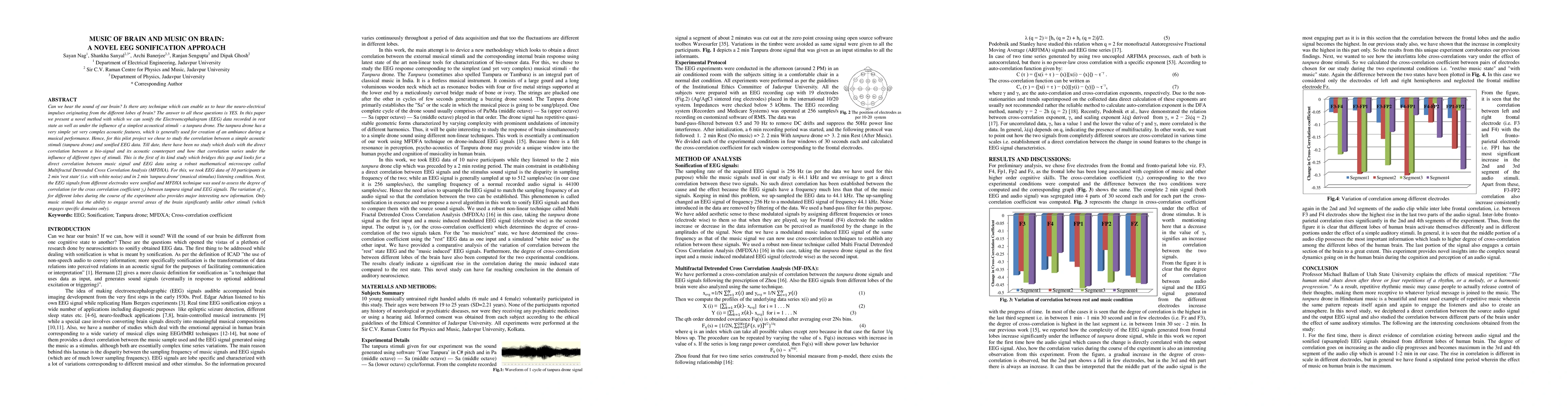 This paper introduces a novel EEG sonification method to convert brain neuro-electrical impulses into sound, specifically correlating EEG data with a tanpura drone. Using Multifractal Detrended Cross Correlation Analysis (MFDXA), it investigates how music stimuli affect brain activity across different lobes, revealing significant engagement of multiple brain areas compared to other stimuli.