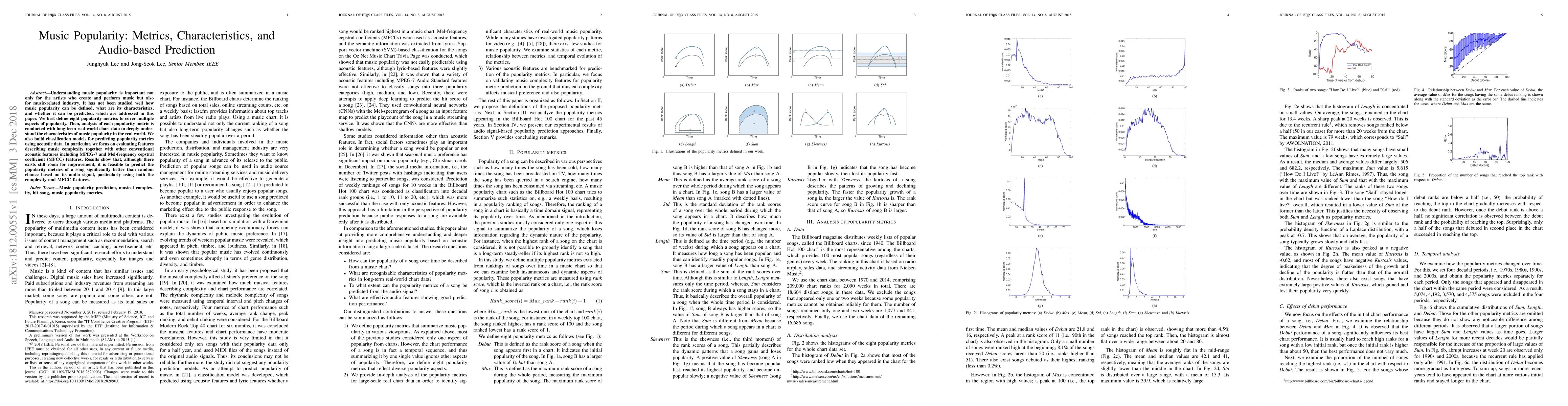 Understanding music popularity is important not only for the artists who create and perform music but also for the music-related industry. It has not been studied well how music popularity can be defined, what its characteristics are, and whether it can be predicted, which are addressed in this paper. We first define eight popularity metrics to cover multiple aspects of popularity. Then, the analysis of each popularity metric is conducted with long-term real-world chart data to deeply understand the characteristics of music popularity in the real world. We also build classification models for predicting popularity metrics using acoustic data. In particular, we focus on evaluating features describing music complexity together with other conventional acoustic features including MPEG-7 and Mel-frequency cepstral coefficient (MFCC) features. The results show that, although room still exists for improvement, it is feasible to predict the popularity metrics of a song significantly better than random chance based on its audio signal, particularly using both the complexity and MFCC features.